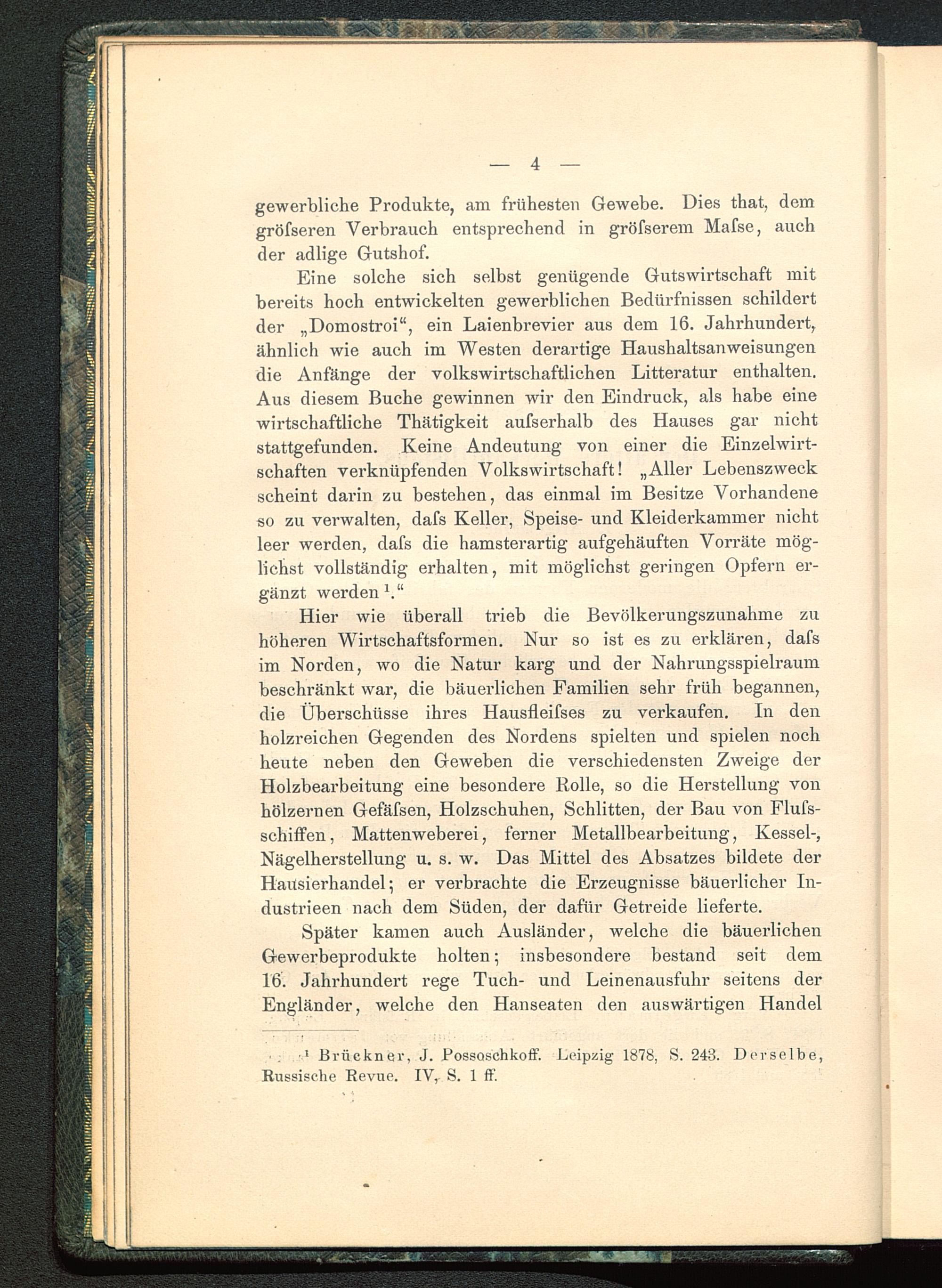 Eine solche sich selbst genügende Gutswirtschaft mitbereits hoch entwickelten gewerblichen Bedürfnissen schildertder „Domostroi", ein Laienbrevier aus dem 16. Jahrhundert,ähnlich wie auch im Westen derartige Haushaltsanweisungendie Anfange der volkswirtschaftlichen Litteratur enthalten.Aus diesem Buche gewinnen wir den Eindruck, als habe einewirtschaftliche Thätigkeit aufserhalb des Hauses gar nichtstattgefunden. Keine Andeutung von einer die Einzelwirt-schaften verknüpfenden Volkswirtschaft! „Aller Lebenszweckscheint darin zu bestehen, das einmal im Besitze Vorhandeneso zu verwalten, dafs Keller, Speise- und Kleiderkammer nichtleer werden, dafs die hamsterartig aufgehäuften Vorräte mög-lichst vollständig erhalten, mit möglichst geringen Opfern er-gänzt werden 1 ."