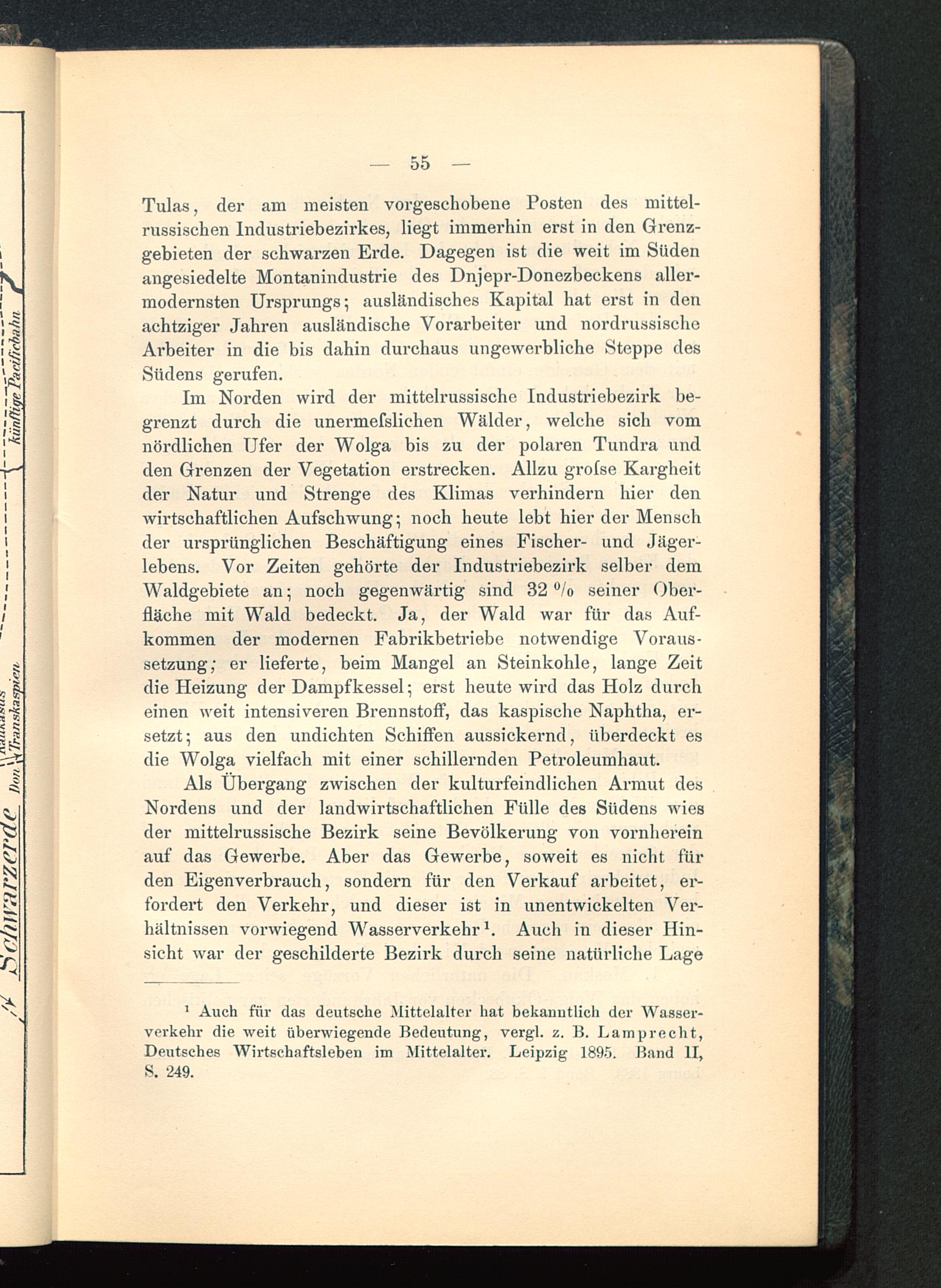 Tulas, der am meisten vorgeschobene Posten des mittel-russischen Industriebezirkes, liegt immerhin erst in den Grenz-gebieten der schwarzen Erde. Dagegen ist die weit im Südenangesiedelte Montanindustrie des Dnjepr -Donezbeckens aller-modernsten Ursprungs 5 ausländisches Kapital hat erst in denachtziger Jahren ausländische Vorarbeiter und nordrussischeArbeiter in die bis dahin durchaus ungewerbliche Steppe desSüdens gerufen.