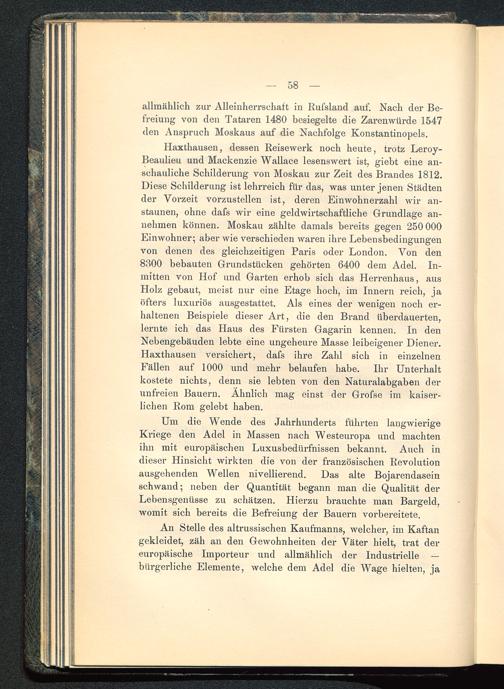 Haxthausen, dessen Reisewerk noch heute, trotz Leroy-Beaulieu und Mackenzie Wallace lesenswert ist, giebt eine an-schauliche Schilderung von Moskau zur Zeit des Brandes 1812.Diese Schilderung ist lehrreich für das, was unter jenen Städtender Vorzeit vorzustellen ist, deren Einwohnerzahl wir an-staunen, ohne dafs wir eine geldwirtschaftliche Grundlage an-nehmen können. Moskau zählte damals bereits gegen 250 000Einwohner; aber wie verschieden waren ihre Lebensbedingungenvon denen des gleichzeitigen Paris oder London . Von den8300 bebauten Grundstücken gehörten 6400 dem Adel. In-mitten von Hof und Garten ei'hob sich das Herrenhaus, ausHolz gebaut, meist nur eine Etage hoch, im Innern reich, jaöfters luxuriös ausgestattet. Als eines der wenigen noch er-haltenen Beispiele dieser Art, die den Brand überdauerten,lernte ich das Haus des Fürsten Gagarin kennen. In denNebengebäuden lebte eine ungeheure Masse leibeigener Diener.Haxthausen versichert, dafs ihre Zahl sich in einzelnenFällen auf 1000 und mehr belaufen habe. Ihr Unterhaltkostete nichts, denn sie lebten von den Naturalabgaben derunfreien Bauern. Ahnlich mag einst der Grofse im kaiser-lichen Rom gelebt haben.