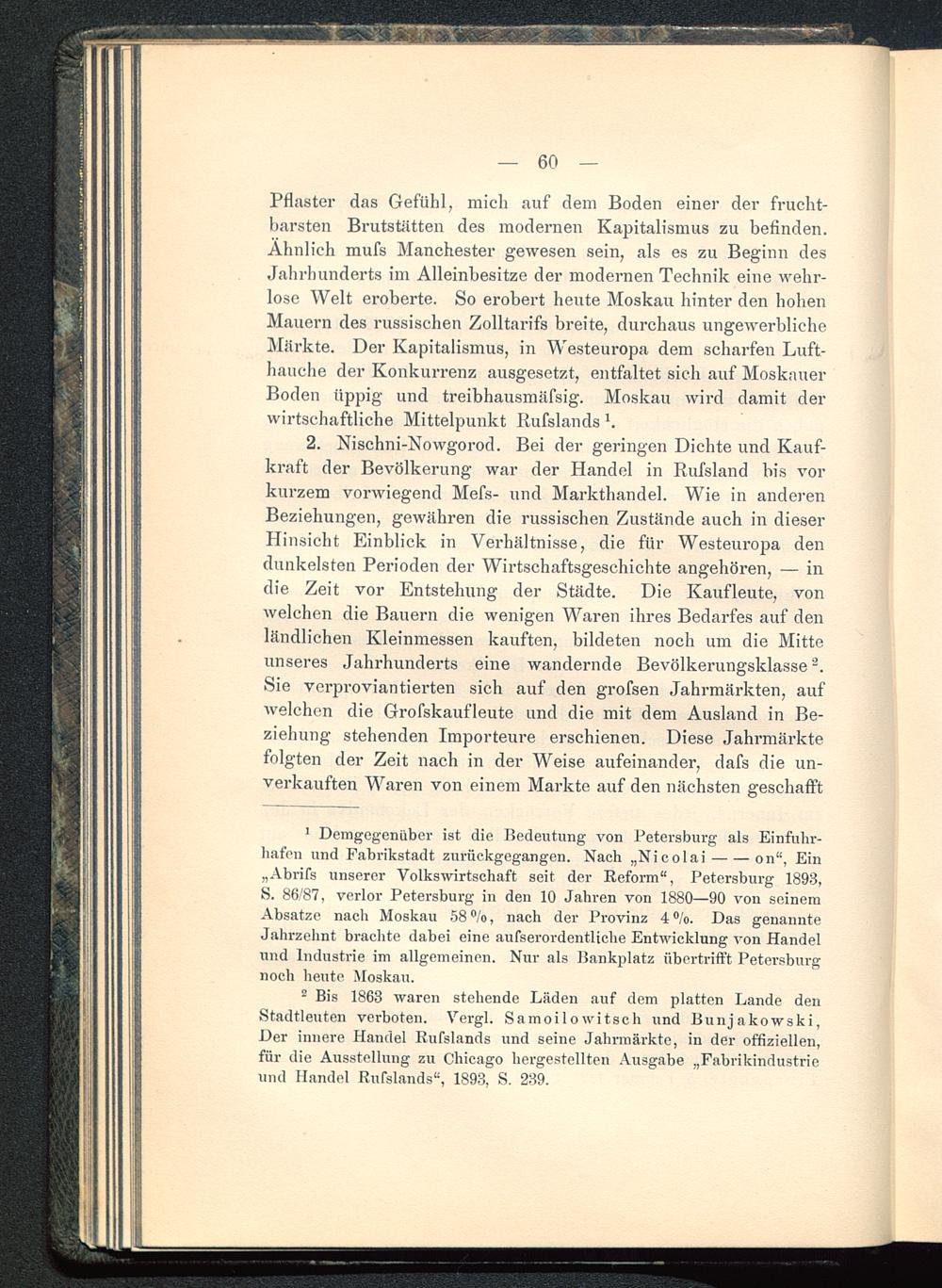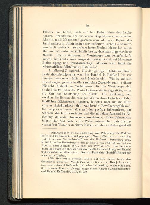 2. Nischni-Nowgorod. Bei der geringen Dichte und Kauf-kraft der Bevölkerung war der Handel in Rufsland bis vorkurzem vorwiegend Mefs- und Markthandel. Wie in anderenBeziehungen, gewähren die russischen Zustände auch in dieserHinsicht Einblick in Verhältnisse, die für Westeuropa dendunkelsten Perioden der Wirtschaftsgeschichte angehören, — indie Zeit vor Entstehung der Städte. Die Kaufleute, vonwelchen die Bauern die wenigen Waren ihres Bedarfes auf denländlichen Kleinmessen kauften, bildeten noch um die Mitteunseres Jahrhunderts eine wandernde Bevölkerungsklasse 2 .Sie verproviantierten sich auf den grofsen Jahrmärkten, aufwelchen die Grofskaufleute und die mit dem Ausland in Be-ziehung stehenden Importeure erschienen. Diese Jahrmärktefolgten der Zeit nach in der Weise aufeinander, dafs die un-verkauften Waren von einem Markte auf den nächsten geschafft