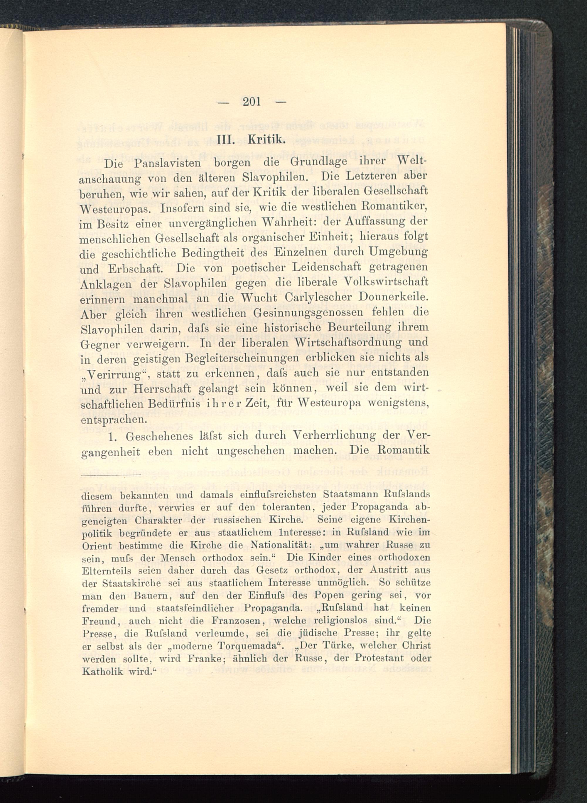Die Panslavisten borgen die Grundlage ihrer Welt-anschauung von den älteren Slavophilen. Die Letzteren aberberuhen, wie wir sahen, auf der Kritik der liberalen GesellschaftWesteuropas . Insofern sind sie, wie die westlichen Romantiker,im Besitz einer unvergänglichen Wahrheit: der Auffassung dermenschlichen Gesellschaft als organischer Einheit; hieraus folgtdie geschichtliche Bedingtheit des Einzelnen durch Umgebungund Erbschaft. Die von poetischer Leidenschaft getragenenAnklagen der Slavophilen gegen die liberale Volkswirtschafterinnern manchmal an die Wucht Carlylescher Donnerkeile.Aber gleich ihren westlichen Gesinnungsgenossen fehlen dieSlavophilen darin, dafs sie eine historische Beurteilung ihremGegner verweigern. In der liberalen Wirtschaftsordnung undin deren geistigen Begleiterscheinungen erblicken sie nichts als„Verirrung", statt zu erkennen, dafs auch sie nur entstandenund zur Herrschaft gelangt sein können, weil sie dem wirt-schaftlichen Bedürfnis ihrer Zeit, für Westeuropa wenigstens,entsprachen.