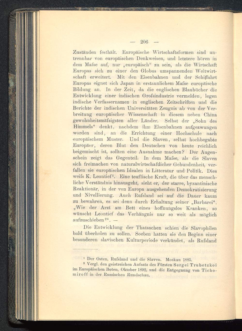 Zuständen festhält. Europäische Wirtschaftsformen sind un-trennbar von europäischen Denkweisen, und letztere hören indem Mafse auf, nur „europäisch" zu sein, als die WirtschaftEuropas sich zu einer den Globus umspannenden Weltwirt-schaft erweitert. Mit den Eisenbahnen und der SchiffahrtEuropas eignet sich Japan in erstaunlichem Mafse europäischeBildung an. In der Zeit, da die englischen Blaubücher dieEntwicklung einer indischen Grofsindustrie vermelden, legenindische Verfassernamen in englischen Zeitschriften und dieBerichte der indischen Universitäten Zeugnis ab von der Ver-breitung europäischer Wissenschaft in diesem neben Chinagewohnheitsmäfsigsten aller Länder. Selbst der „Sohn desHimmels" denkt, nachdem ihm Eisenbahnen aufgezwungenworden sind, an die Errichtung einer Hochschule nacheuropäischem Muster. Und die Slaven, selbst hochbegabteEuropäer, deren Blut den Deutschen von heute reichlichbeigemischt ist, sollten eine Ausnahme machen? Der Augen-schein zeigt das Gegenteil. In dem Mafse, als die Slavensich freimachen von naturalwirtschaftlicher Gebundenheit, ver-fallen sie europäischen Idealen in Litteratur und Politik. Diesweifs K. Leontief 1 . Eine teuflische Kraft, die über das mensch-liche Verständnis hinausgeht, sieht er, der starre, byzantinischeReaktionär, in der von Europa ausgehenden Demokratisierungund Nivellierung. Auch Rufsland sei auf die Dauer kaumzu bewahren, es sei denn durch Erhaltung seiner „Barbarei".„Wie der Arzt am Bett eines hoffnungslos Kranken, sowünscht Leontief das Verhängnis nur so weit als möglichaufzuschieben 2 ". —
