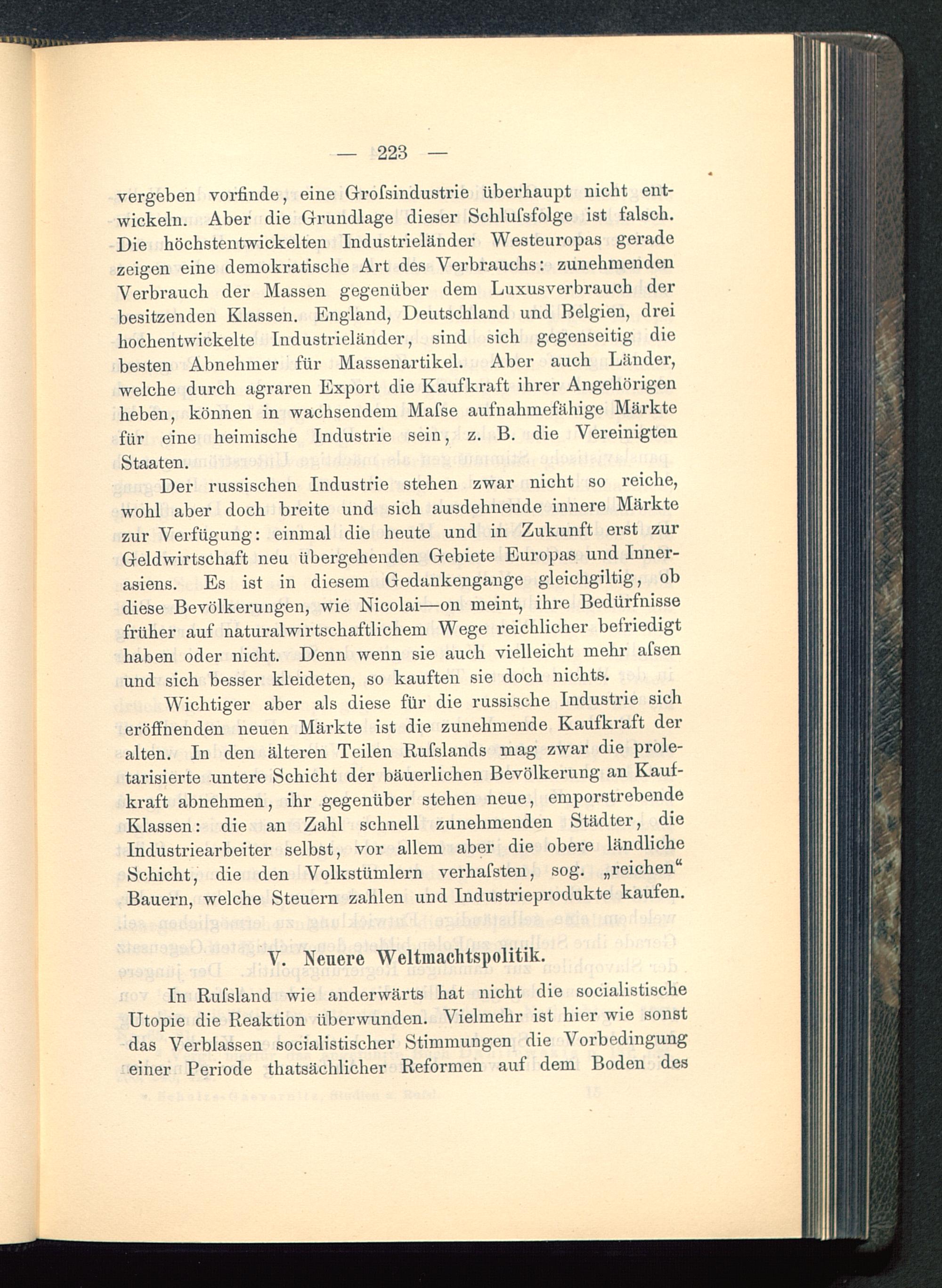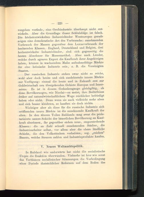 Der russischen Industrie stehen zwar nicht so reiche,wohl aber doch breite und sich ausdehnende innere Märktezur Verfügung: einmal die heute und in Zukunft erst zurGeldwirtschaft neu übergehenden Gebiete Europas und Inner-asiens. Es ist in diesem Gedankengange gleichgiltig, obdiese Bevölkerungen, wie Nicolai—on meint, ihre Bedürfnissefrüher auf naturalwirtschaftlichem Wege reichlicher befriedigthaben oder nicht. Denn wenn sie auch vielleicht mehr afsenund sich besser kleideten, so kauften sie doch nichts.