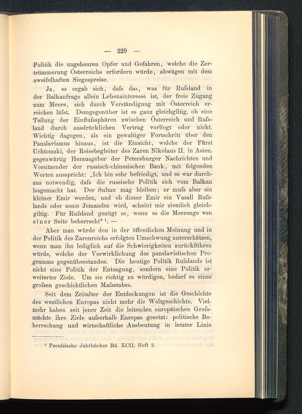 Ja, es ergab sich, dafs das, was für Rufsland inder Balkanfrage allein Lehensinteresse ist, der freie Zugangzum Meere, sich durch Verständigung mit Österreich er-reichen läfst. Demgegenüber ist es ganz gleichgiltig, oh eineTeilung der Einflufssphären zwischen Österreich und Rufs-•land durch ausdrücklichen Vertrag vorliegt oder nicht.Wichtig dagegen, als ein gewaltiger Fortschritt über denPanslavismus hinaus, ist die Einsicht, welche der Füx-stUchtomski, der Reisebegleiter des Zaren Nikolaus II. in Asien ,gegenwärtig Herausgeber der Petersburger Nachrichten undVorsitzender der russisch-chinesischen Bank, mit folgendenWorten ausspricht: „Ich bin sehr befriedigt, und es war durch-aus notwendig, dafs die russische Politik sich vom Balkan losgemacht hat. Der Sultan mag bleiben; er mufs aber einkleiner Emir werden, und ob dieser Emir ein Vasall Rufs-lands oder sonst Jemandes wird, scheint mir ziemlich gleich-giltig. Für Rufsland genügt es, wenn es die Meerenge voneiner Seite beherrscht" 1 .—