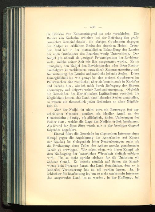 im Bezirke von Konstantinograd ist sehr verschieden. DieBauern von Karlofka erhielten bei der Befreiung den grofs-russischen Gemeindebesitz, die übrigen Gutsbauern dagegenden Nadjel zu erblichem Besitz des einzelnen Hofes. Trotz-dem fand ich in der thatsächlichen Behandlung des Landesbei allen Gutsbauern des Bezirkes wenig Unterschiede. DerNadjel gilt überall als „ewiges" Privateigentum der Revisions-seele, welche seiner Zeit mit ihm ausgestattet wurde. Es istunmöglich, den Nadjel den Revisionsseelen oder ihren Rechts-nachfolgern zu verkleinern, etwa durch Zusammenwerfung undNeuverteilung des Landes auf sämtliche lebende Seelen. DieseUnmöglichkeit ist, wie gesagt bei den meisten Gutsbauern imPoltawaschen eine rechtliche; aber sie besteht auch in Karlofkaund beruht hier, wie ich mich durch Befragung der Bauernüberzeugte, auf tiefgewurzelter Rechtsüberzeugung. Obgleichdie Gemeinden des Karlofkischen Latifundiums rechtlich dieMöglichkeit hätten, das Land nach lebenden Seelen umzuteilen,so weisen sie thatsächlich jeden Gedanken an diese Möglich-keit ab.
