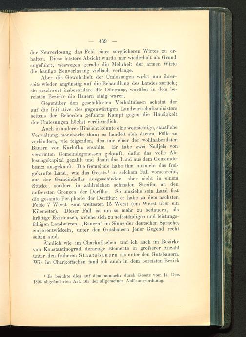 Auch in anderer Hinsicht könnte eine weitsichtige, staatlicheVerwaltung mancherlei thun; es handelt sich darum, Fälle zuverhindern, wie folgenden, den mir einer der wohlhabendstenBauern von Karlofka erzählte. Er habe zwei Nadjele vonverarmten Gemeindegenossen gekauft, dafür das volle Ab-lösungskapital gezahlt und damit das Land aus dem Gemeinde-besitz ausgekauft. Die Gemeinde habe ihm nunmehr das frei-gekaufte Land, wie das Gesetz 1 in solchem Fall vorschreibt,aus der Gemeindeflur ausgeschieden, aber nicht in einemStücke, sondern in zahlreichen schmalen Streifen an denäufsersten Grenzen der Dorfflur. So umziehe sein Land fastdie gesamte Peripherie der Dorfflur; er habe zu dem nächstenFelde 7 Werst, zum weitesten 15 Werst (ein Werst über einKilometer). Dieser Fall ist um so mehr zu bedauern, alskräftige Existenzen, welche sich zu selbständigen und leistungs-fähigen Landwirten, „Bauern" im Sinne der deutschen Spi'ache,emporentwickeln, unter den Gutsbauern jener Gegend rechtselten sind.