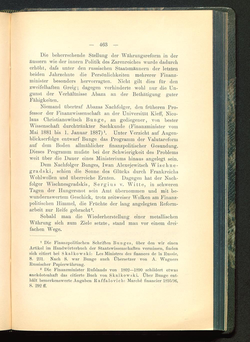 1 Die Finanzpolitischen Schriften Bunges, über den wir einenArtikel im Handwörterbuch der Staatswissenschaften vermissen, findensich citiert hei Skalkowski: Les Ministres des finances de la Eussie,S. 231. Nach S. war Bunge auch Übersetzer von A. WagnersRussischer Papierwährung.