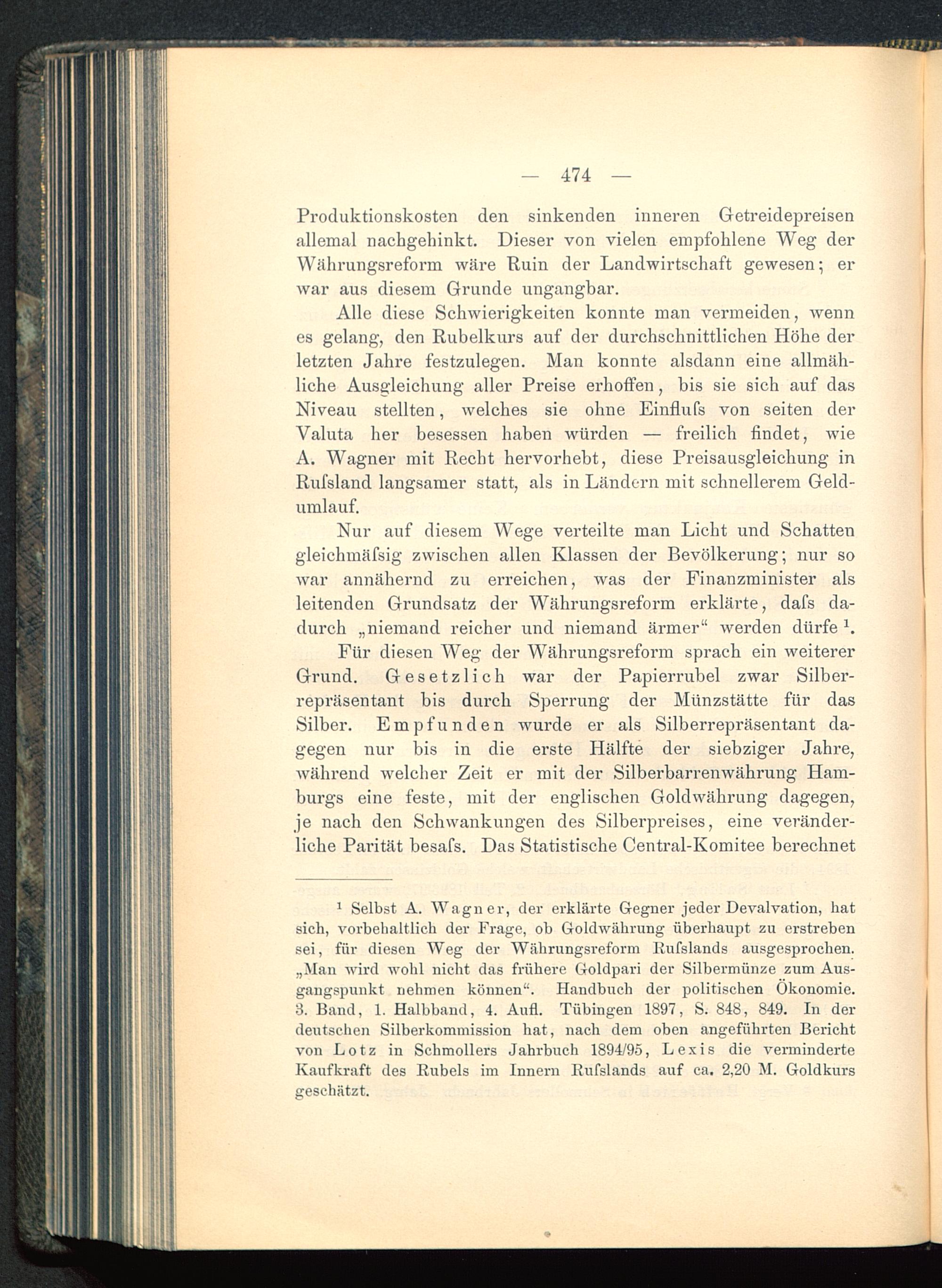 Alle diese Schwierigkeiten konnte man vermeiden, wennes gelang, den Rubelkurs auf der durchschnittlichen Höhe derletzten Jahre festzulegen. Man konnte alsdann eine allmäh-liche Ausgleichung aller Preise erhoffen, bis sie sich auf dasNiveau stellten, welches sie ohne Einflufs von seiten derValuta her besessen haben würden — freilich findet, wieA. Wagner mit Recht hervorhebt, diese Preisausgleichung inRufsland langsamer statt, als in Ländern mit schnellerem Geld-umlauf.