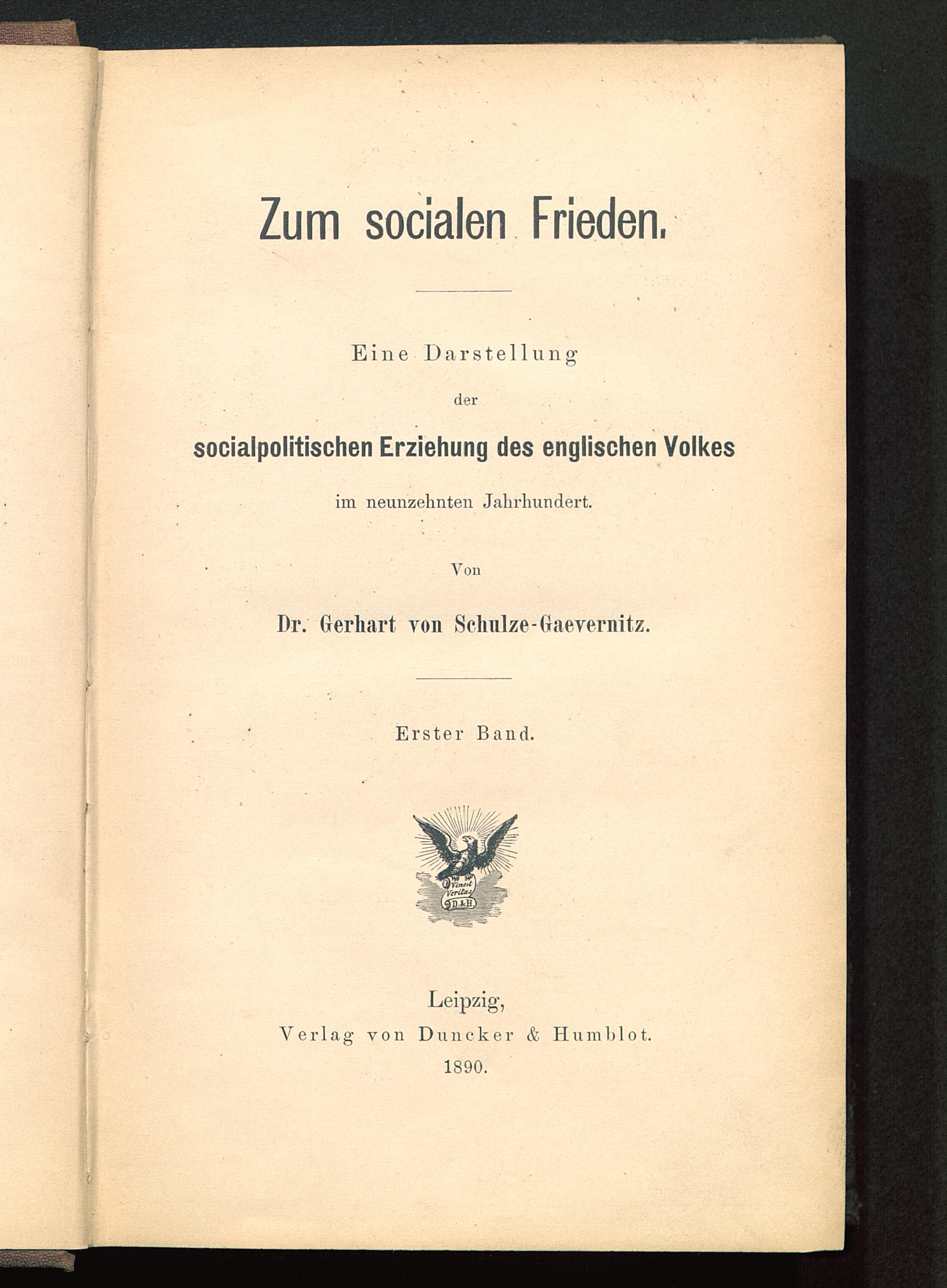 Zum socialen Frieden.Eine Darstellungdersocialpolitischen Erziehung des englischen Volkesim neunzehnten Jahrhundert.VonDr. Gerhart von Schulze - Gaevernitz .Erster Band.Verlag vonLeipzig ,D u n c k e r1890.& H u m b 1 o t.