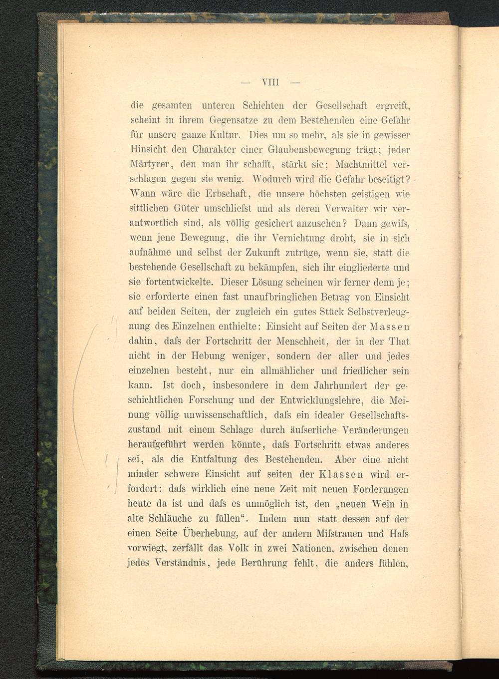 die gesamten unteren Schichten der Gesellschaft ergreift,scheint in ihrem Gegensatze zu dem Bestehenden eine Gefahrfür unsere ganze Kultur. Dies um so mehr, als sie in gewisserHinsicht den Charakter einer Glaubensbewegung trägt; jederMärtyrer, den man ihr schafft, stärkt sie; Machtmittel ver-schlagen gegen sie wenig. Wodurch wird die Gefahr beseitigt?Wann wäre die Erbschaft, die unsere höchsten geistigen wiesittlichen Güter umschliefst und als deren Verwalter wir ver-antwortlich sind, als völlig gesichert anzusehen? Dann gewifs,wenn jene Bewegung, die ihr Vernichtung droht, sie in sichaufnähme und selbst der Zukunft zutrüge, wenn sie, statt diebestehende Gesellschaft zu bekämpfen, sich ihr eingliederte undsie fortentwickelte. Dieser Lösung scheinen wir ferner denn je;sie erforderte einen fast unaufbringlichen Betrag von Einsichtauf beiden Seiten, der zugleich ein gutes Stück Selbstverleug-nung des Einzelnen enthielte: Einsicht auf Seiten der M a s s e ndahin, dafs der Fortschritt der Menschheit, der in der Thatnicht in der Hebung weniger, sondern der aller und jedeseinzelnen besteht, nur ein allmählicher und friedlicher seinkann. Ist doch, insbesondere in dem Jahrhundert der ge-schichtlichen Forschung und der Entwicklungslehre, die Mei-nung völlig unwissenschaftlich, dafs ein idealer Gesellschafts-zustand mit einem Schlage durch äufserliche Veränderungenheraufgeführt werden könnte, dafs Fortschritt etwas anderessei, als die Entfaltung des Bestehenden. Aber eine nichtminder schwere Einsicht auf Seiten der Klassen wird er-fordert: dafs wirklich eine neue Zeit mit neuen Forderungenheute da ist und dafs es unmöglich ist, den „neuen Wein inalte Schläuche zu füllen". Indem nun statt dessen auf dereinen Seite Überhebung, auf der andern Mifstrauen und Hafs vorwiegt, zerfällt das Volk in zwei Nationen, zwischen denenjedes Verständnis, jede Berührung fehlt, die anders fühlen,
