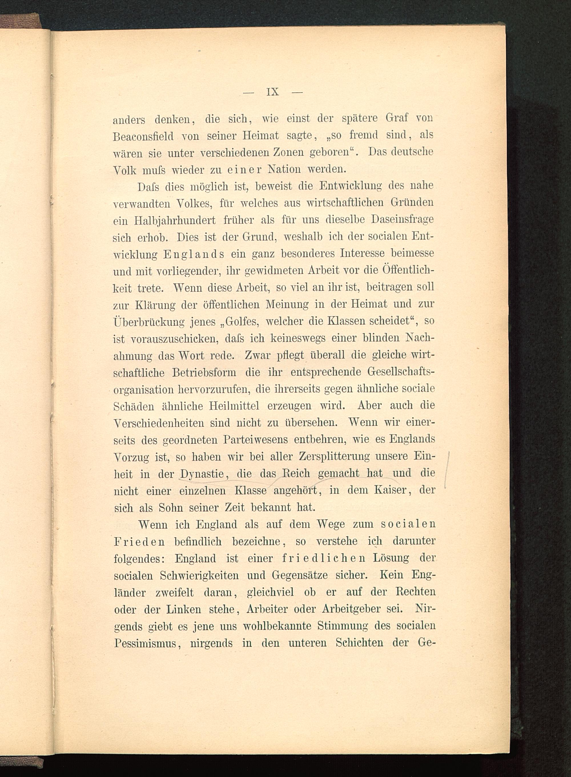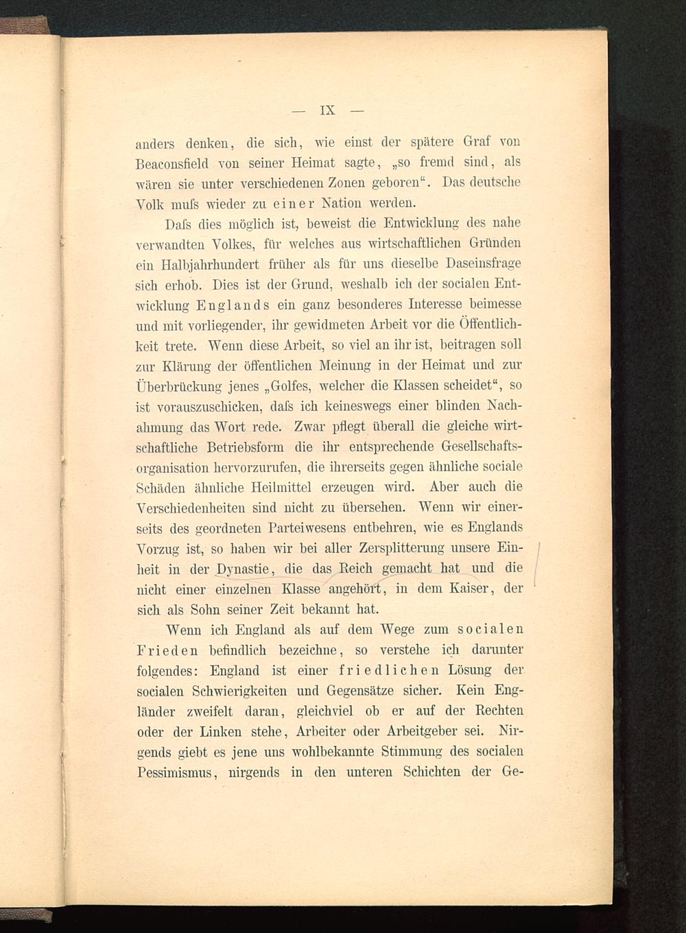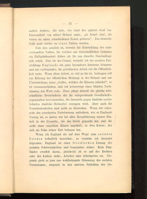 Dafs dies möglich ist, beweist die Entwicklung des naheverwandten Volkes, für welches aus wirtschaftlichen Gründenein Halbjahrhundert früher als für uns dieselbe Daseinsfragesich erhob. Dies ist der Grund, weshalb ich der socialen Ent-wicklung Englands ein ganz besonderes Interesse beimesseund mit vorliegender, ihr gewidmeten Arbeit vor die Öffentlich-keit trete. Wenn diese Arbeit, so viel an ihr ist, beitragen sollzur Klärung der öffentlichen Meinung in der Heimat und zurÜberbrückung jenes „Golfes, welcher die Klassen scheidet", soist vorauszuschicken, dafs ich keineswegs einer blinden Nach-ahmung das Wort rede. Zwar pflegt überall die gleiche wirt-schaftliche Betriebsform die ihr entsprechende Gesellschafts-organisation hervorzurufen, die ihrerseits gegen ähnliche socialeSchäden ähnliche Heilmittel erzeugen wird. Aber auch dieVerschiedenheiten sind nicht zu übersehen. Wenn wir einer-seits des geordneten Parteiwesens entbehren, wie es Englands Vorzug ist, so haben wir bei aller Zersplitterung unsere Ein-heit in der Dynastie, die das Reich gemacht hat und dienicht einer einzelnen Klasse angehört, in dem Kaiser, dersich als Sohn seiner Zeit bekannt hat.