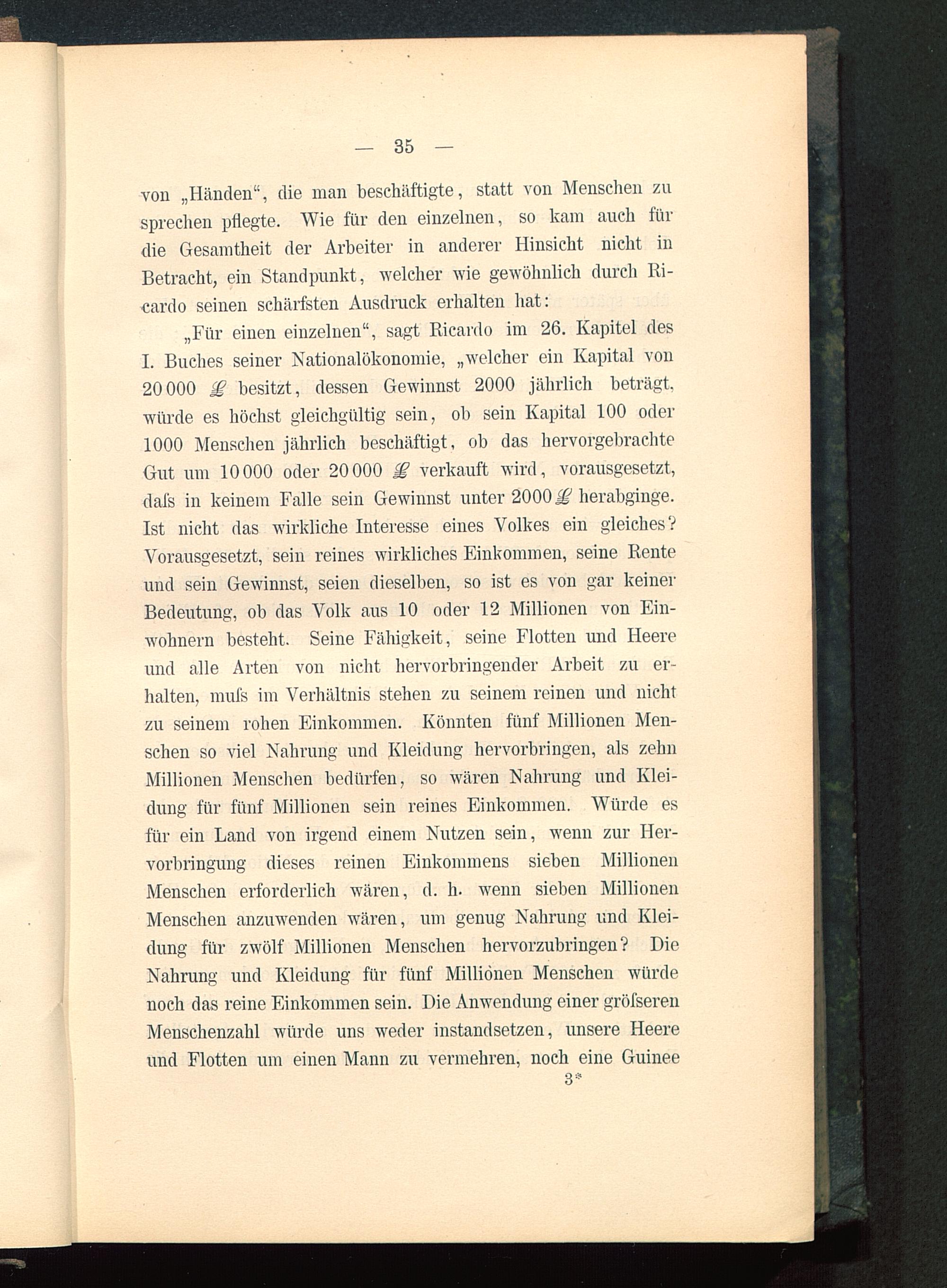 „Für einen einzelnen", sagt Ricardo im 26. Kapitel desI. Buches seiner Nationalökonomie, „welcher ein Kapital von20 000 JF besitzt, dessen Gewinnst 2000 jährlich beträgt,würde es höchst gleichgültig sein, ob sein Kapital 100 oder1000 Menschen jährlich beschäftigt, ob das hervorgebrachteGut um 10000 oder 20000 verkauft wird, vorausgesetzt,dafs in keinem Falle sein Gewinnst unter 2000JF herabginge.Ist nicht das wirkliche Interesse eines Volkes ein gleiches?Vorausgesetzt, sein reines wirkliches Einkommen, seine Renteund sein Gewinnst, seien dieselben, so ist es von gar keinerBedeutung, ob das Volk aus 10 oder 12 Millionen von Ein-wohnern besteht. Seine Fähigkeit, seine Flotten und Heereund alle Arten von nicht hervorbringender Arbeit zu er-halten, mufs im Verhältnis stehen zu seinem reinen und nichtzu seinem rohen Einkommen. Könnten fünf Millionen Men-schen so viel Nahrung und Kleidung hervorbringen, als zehnMillionen Menschen bedürfen, so wären Nahrung und Klei-dung für fünf Millionen sein reines Einkommen. Würde esfür ein Land von irgend einem Nutzen sein, wenn zur Her-vorbringung dieses reinen Einkommens sieben MillionenMenschen erforderlich wären, d. h. wenn sieben MillionenMenschen anzuwenden wären, um genug Nahrung und Klei-dung für zwölf Millionen Menschen hervorzubringen? DieNahrung und Kleidung für fünf Millionen Menschen würdenoch das reine Einkommen sein. Die Anwendung einer gröfserenMenschenzahl würde uns weder instandsetzen, unsere Heere