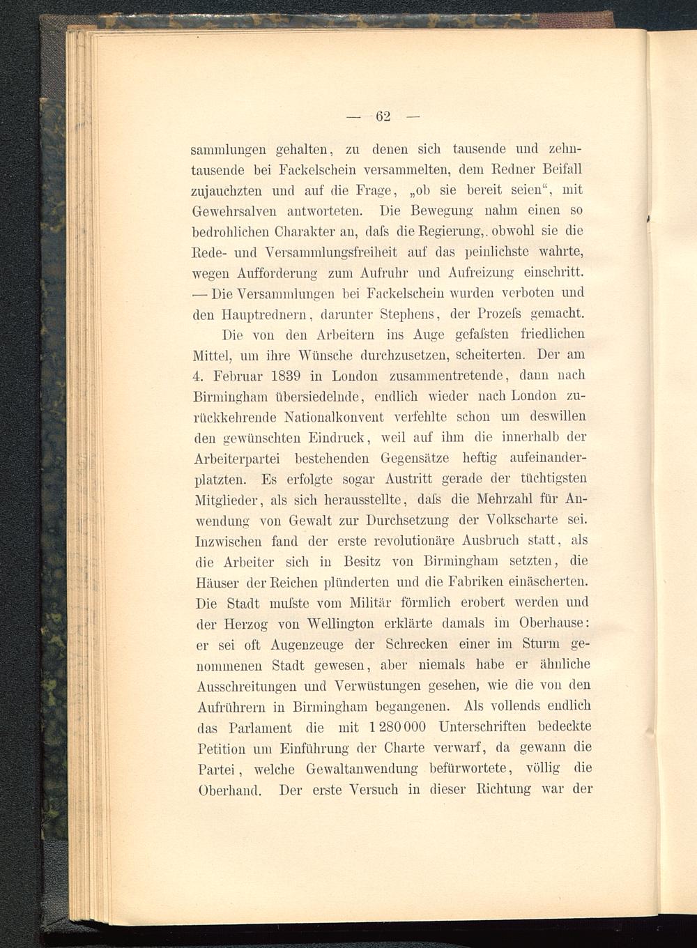 Die von den Arbeitern ins Auge gefafsten friedlichenMittel, um ihre Wünsche durchzusetzen, scheiterten. Der am4. Februar 1839 in London zusammentretende, dann nachBirmingham übersiedelnde, endlich wieder nach London zu-rückkehrende Nationalkonvent verfehlte schon um deswillenden gewünschten Eindruck, weil auf ihm die innerhalb derArbeiterpartei bestehenden Gegensätze heftig aufeinander-platzten. Es erfolgte sogar Austritt gerade der tüchtigstenMitglieder, als sich herausstellte, dafs die Mehrzahl für An-wendung von Gewalt zur Durchsetzung der Volkscharte sei.Inzwischen fand der erste revolutionäre Ausbruch statt, alsdie Arbeiter sich in Besitz von Birmingham setzten, dieHäuser der Reichen plünderten und die Fabriken einäscherten.Die Stadt mufste vom Militär förmlich erobert werden undder Herzog von Wellington erklärte damals im Oberhause:er sei oft Augenzeuge der Schrecken einer im Sturm ge-nommenen Stadt gewesen, aber niemals habe er ähnlicheAusschreitungen und Verwüstungen gesehen, wie die von denAufrührern in Birmingham begangenen. Als vollends endlichdas Parlament die mit 1 280000 Unterschriften bedecktePetition um Einführung der Charte verwarf, da gewann diePartei, welche Gewaltanwendung befürwortete, völlig dieOberhand. Der erste Versuch in dieser Richtung war der