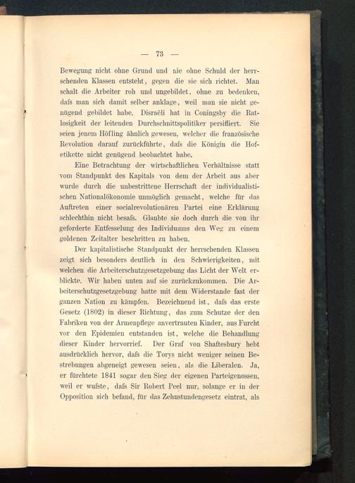 Der kapitalistische Standpunkt der herrschenden Klassenzeigt sich besonders deutlich in den Schwierigkeiten, mitwelchen die Arbeiterschutzgesetzgebung das Licht der Welt er-blickte. Wir haben unten auf sie zurückzukommen. Die Ar-beiterschutzgesetzgebung hatte mit dem Widerstande fast derganzen Nation zu kämpfen. Bezeichnend ist, dafs das ersteGesetz (1802) in dieser Richtung, das zum Schutze der denFabriken von der Armenpflege anvertrauten Kinder, aus Furchtvor den Epidemien entstanden ist, welche die Behandlungdieser Kinder hervorrief. Der Graf von Shaftesbury hebtausdrücklich hervor, dafs die Torys nicht weniger seinen Be-strebungen abgeneigt gewesen seien, als die Liberalen. Ja,er fürchtete 1841 sogar den Sieg der eigenen Parteigenossen,weil er wufste, dafs Sir Robert Peel nur, solange er in derOpposition sich befand, für das Zehnstundengesetz eintrat, als