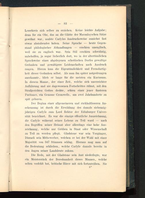 Der Beginn einer allgemeineren und rückhaltloseren An-erkennung ist durch die Erwählung des damals siebenzig-jährigen Carlyle zum Lord Rektor der Edinburger Univer-sität bezeichnet. Es war die einzige öffentliche Auszeichnung,die Carlyle während seines Lebens zu Teil ward — nachden Begriffen seiner Heimat aber allerdings eine hohe Aus-zeichnung, welche nur Gröfsen in Staat oder Wissenschaftzu Teil zu werden pflegt. Gladstone war sein Vorgänger,Disraeli sein Mitbewerber, welchen er bei der Wahl mit einerMajorität von 347 Stimmen schlug. Hieraus mag man aufdie Bedeutung schliefsen, welche Carlyle damals bereits inden Augen seiner Landsleute zukam.