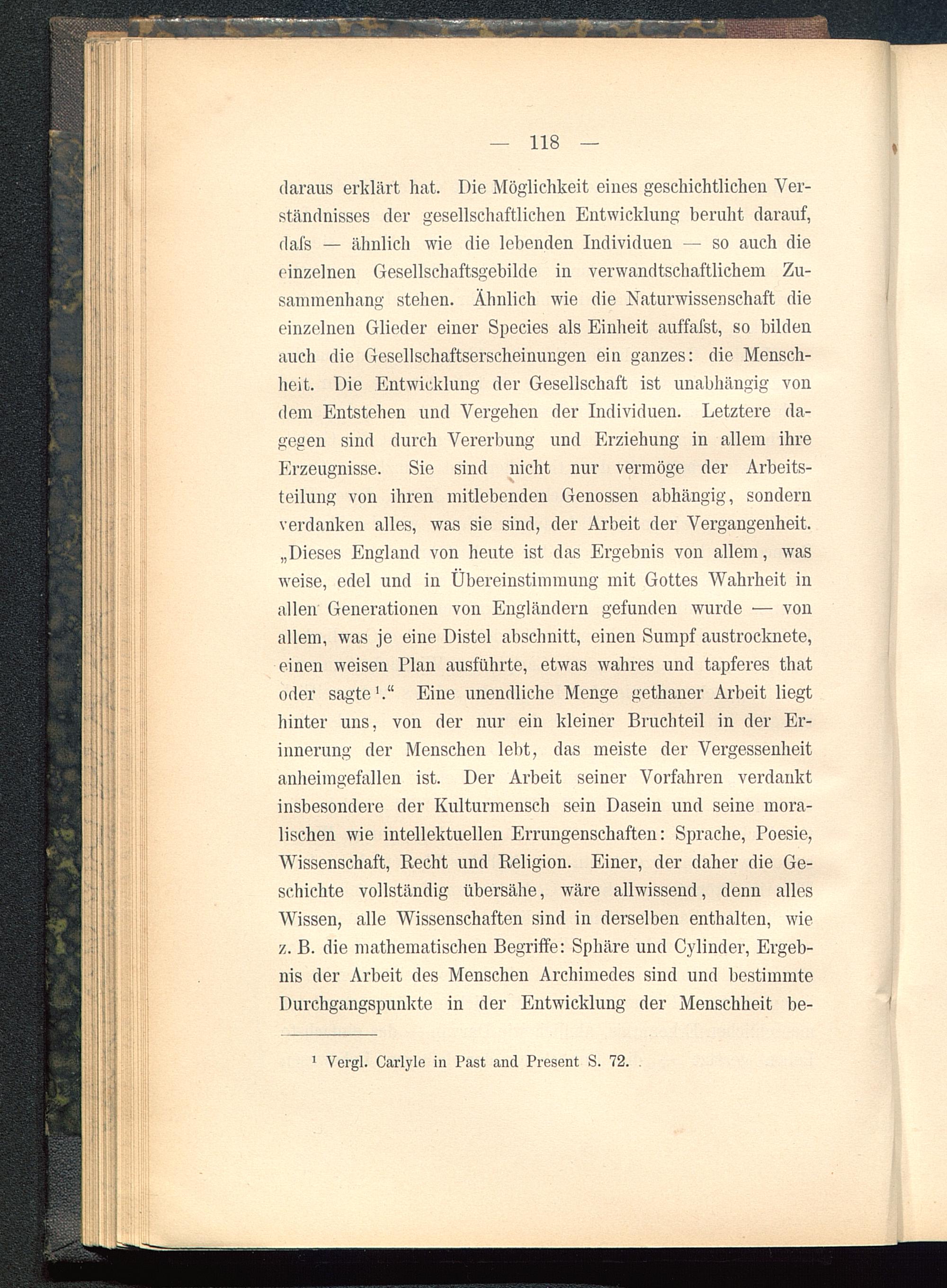 daraus erklärt hat. Die Möglichkeit eines geschichtlichen Ver-ständnisses der gesellschaftlichen Entwicklung beruht darauf,dafs — ähnlich wie die lebenden Individuen — so auch dieeinzelnen Gesellschaftsgebilde in verwandtschaftlichem Zu-sammenhang stehen. Ähnlich wie die Naturwissenschaft dieeinzelnen Glieder einer Species als Einheit auffafst, so bildenauch die Gesell Schaftserscheinungen ein ganzes: die Mensch-heit. Die Entwicklung der Gesellschaft ist unabhängig vondem Entstehen und Vergehen der Individuen. Letztere da-gegen sind durch Vererbung und Erziehung in allem ihreErzeugnisse. Sie sind nicht nur vermöge der Arbeits-teilung von ihren mitlebenden Genossen abhängig, sondernverdanken alles, was sie sind, der Arbeit der Vergangenheit.„Dieses England von heute ist das Ergebnis von allem, wasweise, edel und in Übereinstimmung mit Gottes Wahrheit inallen Generationen von Engländern gefunden wurde — vonallem, was je eine Distel abschnitt, einen Sumpf austrocknete,einen weisen Plan ausführte, etwas wahres und tapferes thatoder sagte 1 ." Eine unendliche Menge gethaner Arbeit liegthinter uns, von der nur ein kleiner Bruchteil in der Er-innerung der Menschen lebt, das meiste der Vergessenheitanheimgefallen ist. Der Arbeit seiner Vorfahren verdanktinsbesondere der Kulturmensch sein Dasein und seine mora-lischen wie intellektuellen Errungenschaften: Sprache, Poesie,Wissenschaft, Recht und Religion. Einer, der daher die Ge-schichte vollständig übersähe, wäre allwissend, denn allesWissen, alle Wissenschaften sind in derselben enthalten, wiez. B. die mathematischen Begriffe: Sphäre und Cylinder, Ergeb-nis der Arbeit des Menschen Archimedes sind und bestimmteDurchgangspunkte in der Entwicklung der Menschheit be-