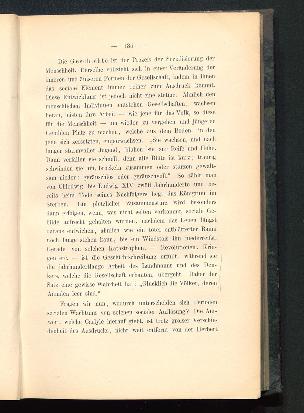 Die Geschichte ist der Prozefs der Socjalisierung derMenschheit. Derselbe vollzieht sich in einer Veränderung derinneren und äufseren Formen der Gesellschaft, indem in ihnendas sociale Element immer reiner zum Ausdruck kommt.Diese Entwicklung ist jedoch nicht eine stetige. Ähnlich denmenschlichen Individuen entstehen Gesellschaften, wachsenheran, leisten ihre Arbeit — wie jene für das Volk, so diesefür die Menschheit — um wieder zu vergehen und jüngerenGebilden Platz zu machen, welche aus dem Boden, in denjene sich zersetzten, emporwachsen. „Sie wachsen, und nachlanger sturmvoller Jugend, blühen sie zur Reife und Höhe.Dann verfallen sie schnell, denn alle Blüte ist kurz; traurigschwinden sie hin, bröckeln zusammen oder stürzen gewalt-sam nieder: geräuschlos oder geräuschvoll." So zählt manvon Chlodwig bis Ludwig XIV zwölf Jahrhunderte und be-reits beim Tode seines Nachfolgers liegt das Königtum imSterben. Ein plötzlicher Zusammensturz wird besondersdann erfolgen, wenn, was nicht selten vorkommt, sociale Ge-bilde aufrecht gehalten wurden, nachdem das Leben längstdaraus entwichen, ähnlich wie ein toter entblätterter Baumnoch lange stehen kann, bis ein Windstofs ihn niederreifst.Gerade von solchen Katastrophen, — Revolutionen, Krie-gen etc. — ist die Geschichtschreibung erfüllt, während siedie jahrhundertlange Arbeit des Landmanns und des Den-kers, welche die Gesellschaft erbauten, übergeht. Daher derSatz eine gewisse Wahrheit hat: „Glücklich die Völker, derenAnnalen leer sind."