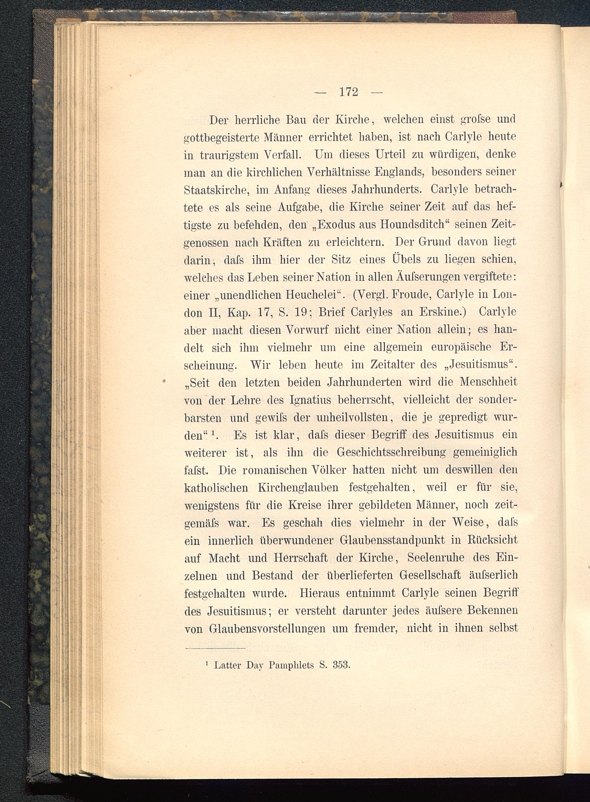 Der herrliche Bau der Kirche, welchen einst grofse undgottbegeisterte Männer errichtet haben, ist nach Carlyle heutein traurigstem Verfall. Um dieses Urteil zu würdigen, denkeman an die kirchlichen Verhältnisse Englands , besonders seinerStaatskirche, im Anfang dieses Jahrhunderts. Carlyle betrach-tete es als seine Aufgabe, die Kirche seiner Zeit auf das hef-tigste zu befehden, den „Exodus aus Houndsditch" seinen Zeit-genossen nach Kräften zu erleichtern. Der Grund davon liegtdarin, dafs ihm hier der Sitz eines Übels zu liegen schien,welches das Leben seiner Nation in allen Äufserungen vergiftete:einer „unendlichen Heuchelei". (Vergl. Froude, Carlyle in Lon-don II, Kap. 17, S. 19; Brief Carlyles an Erskine.) Carlyleaber macht diesen Vorwurf nicht einer Nation allein; es han-delt sich ihm vielmehr um eine allgemein europäische Er-scheinung. Wir leben heute im Zeitalter des „Jesuitismus".