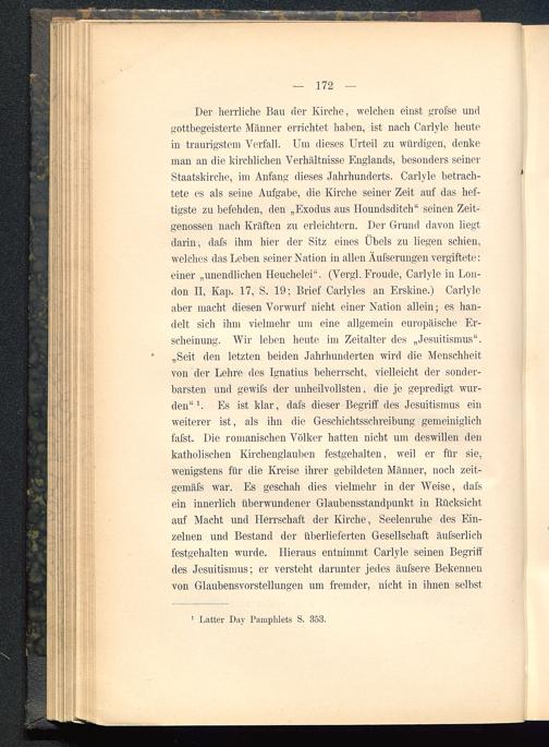 * „ Seit den letzten beiden Jahrhunderten wird die Menschheitvon der Lehre des Ignatius beherrscht, vielleicht der sonder-barsten und gewifs der unheilvollsten, die je gepredigt wur-den" 1 . Es ist klar, dals dieser Begriff des Jesuitismus einweiterer ist, als ihn die Geschichtsschreibung gemeiniglichfafst. Die romanischen Völker hatten nicht um deswillen denkatholischen Kirchenglauben festgehalten, weil er für sie,wenigstens für die Kreise ihrer gebildeten Männer, noch zeit-gemäfs war. Es geschah dies vielmehr in der Weise, dafsein innerlich überwundener Glaubensstandpunkt in Rücksichtauf Macht und Herrschaft der Kirche, Seelenruhe des Ein-zelnen und Bestand der überlieferten Gesellschaft äufserlichfestgehalten wurde. Hieraus entnimmt Carlyle seinen Begriffdes Jesuitismus; er versteht darunter jedes äufsere Bekennenvon Glaubensvorstellungen um fremder, nicht in ihnen selbst