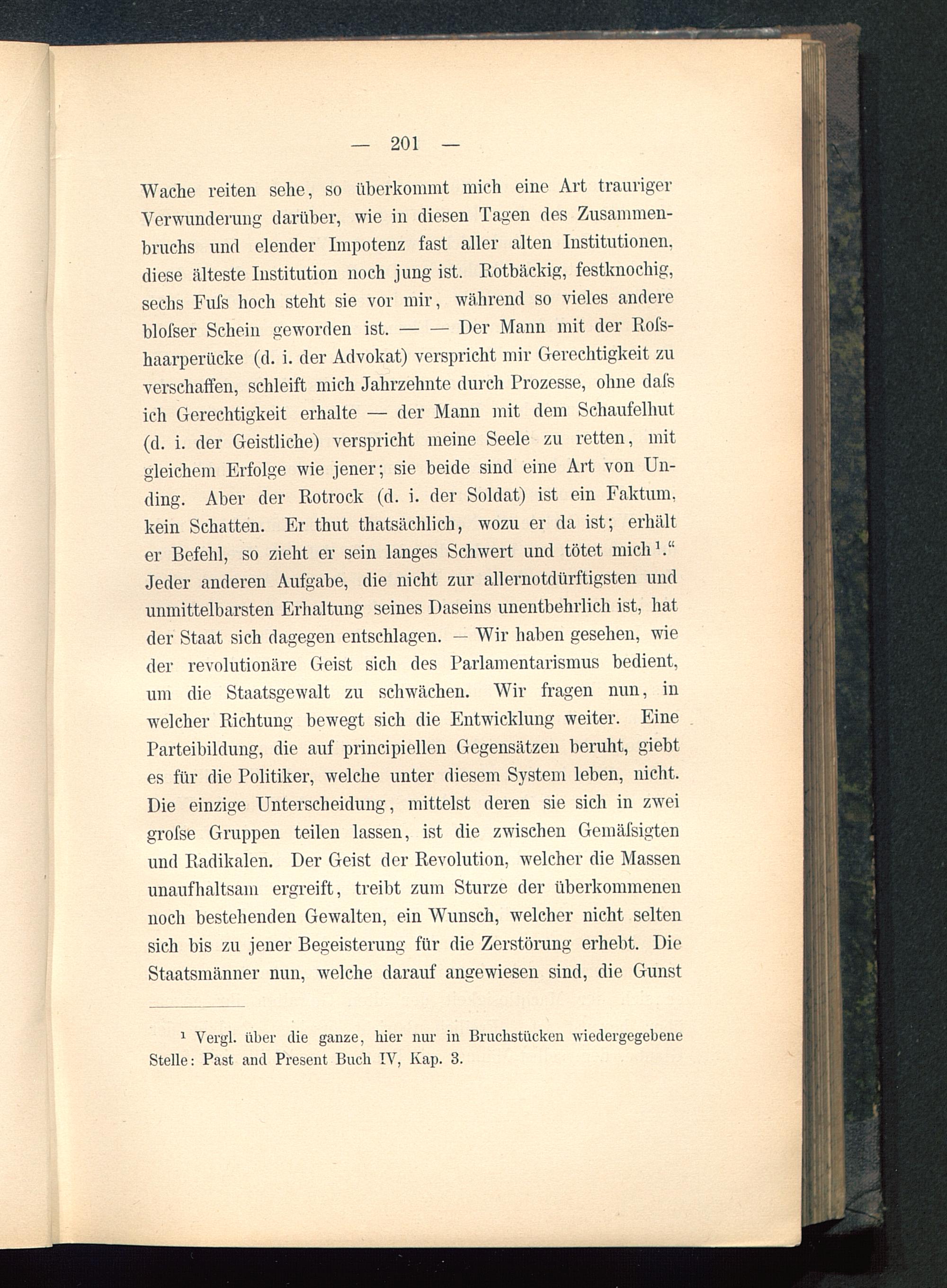 haarperüclce (d. i. der Advokat) verspricht mir Gerechtigkeit zuverschaffen, schleift mich Jahrzehnte durch Prozesse, ohne dafsich Gerechtigkeit erhalte — der Mann mit dem Schaufelhut(d. i. der Geistliche) verspricht meine Seele zu retten, mitgleichem Erfolge wie jener; sie beide sind eine Art von Un-ding. Aber der Rotrock (d. i. der Soldat) ist ein Faktum,kein Schatten. Er thut thatsächlich, wozu er da ist; erhälter Befehl, so zieht er sein langes Schwert und tötet mich 1 ."Jeder anderen Aufgabe, die nicht zur all ernotdürftigsten undunmittelbarsten Erhaltung seines Daseins unentbehrlich ist, hatder Staat sich dagegen entschlagen. — Wir haben gesehen, wieder revolutionäre Geist sich des Parlamentarismus bedient,um die Staatsgewalt zu schwächen. Wir fragen nun, inwelcher Richtung bewegt sich die Entwicklung weiter. EineParteibildung, die auf principiellen Gegensätzen beruht, giebtes für die Politiker, welche unter diesem System leben, nicht.Die einzige Unterscheidung, mittelst deren sie sich in zweigrofse Gruppen teilen lassen, ist die zwischen Gemäfsigtenund Radikalen. Der Geist der Revolution, welcher die Massenunaufhaltsam ergreift, treibt zum Sturze der überkommenennoch bestehenden Gewalten, ein Wunsch, welcher nicht seltensich bis zu jener Begeisterung für die Zerstörung erhebt. DieStaatsmänner nun, welche darauf angewiesen sind, die Gunst