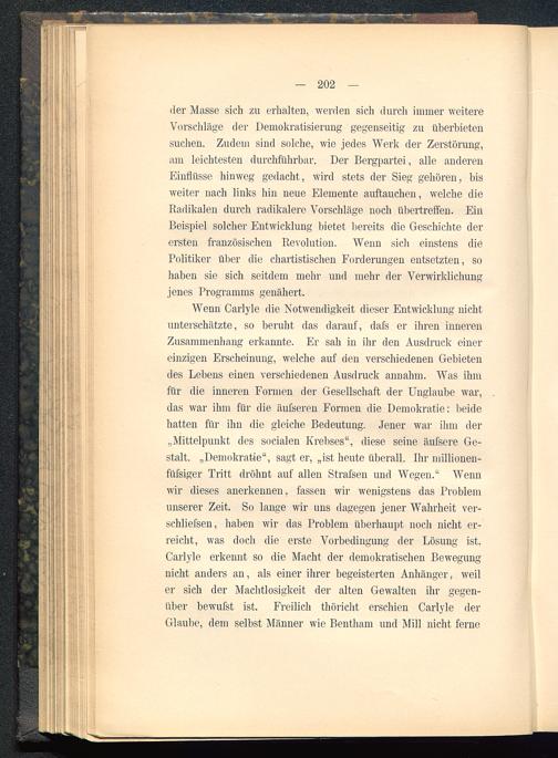 Wenn Carlyle die Notwendigkeit dieser Entwicklung nichtunterschätzte, so beruht das darauf, dafs er ihren innerenZusammenhang erkannte. Er sah in ihr den Ausdruck einereinzigen Erscheinung, welche auf den verschiedenen Gebietendes Lehens einen verschiedenen Ausdruck annahm. Was ihmfür die inneren Formen der Gesellschaft der Unglaube war,das war ihm für die äufseren Formen die Demokratie: beidehatten für ihn die gleiche Bedeutung. Jener war ihm der„Mittelpunkt des socialen Krebses", diese seine äufsere Ge-stalt. „Demokratie", sagt er, „ist heute überall. Ihr millionen-füfsiger Tritt dröhnt auf allen Strafsen und Wegen." Wennwir dieses anerkennen, fassen wir wenigstens das Problemunserer Zeit. So lange wir uns dagegen jener Wahrheit ver-schliefsen, haben wir das Problem überhaupt noch nicht er-reicht, was docli die erste Vorbedingung der Lösung ist.Carlyle erkennt so die Macht der demokratischen Bewegungnicht anders an, als einer ihrer begeisterten Anhänger, weiler sich der Machtlosigkeit der alten Gewalten ihr gegen-über bewufst ist. Freilich thöricht erschien Carlyle derGlaube, dem selbst Männer wie Bentham und Mill nicht ferne