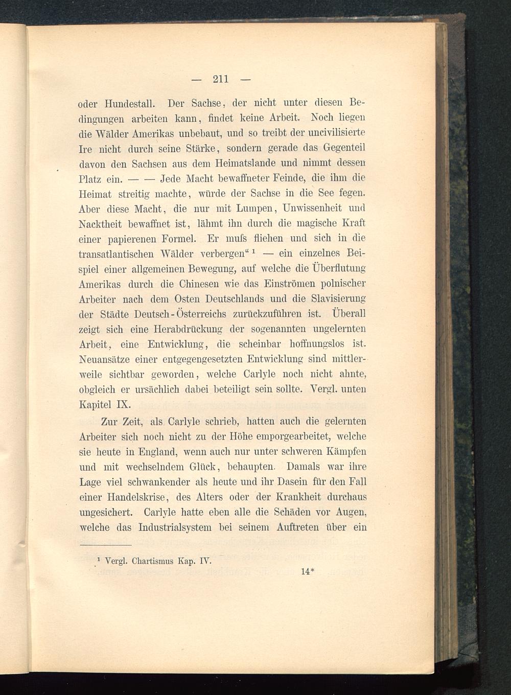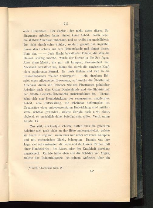 Heimat streitig machte, würde der Sachse in die See fegen.Aber diese Macht, die nur mit Lumpen, Unwissenheit undNacktheit bewaffnet ist, lähmt ihn durch die magische Krafteiner papierenen Formel. Er mufs fliehen und sich in dietransatlantischen Wälder verbergen" 1 — ein einzelnes Bei-spiel einer allgemeinen Bewegung, auf welche die ÜberflutungAmerikas durch die Chinesen wie das Einströmen polnischerArbeiter nach dem Osten Deutschlands und die Slavisierungder Städte Deutsch-Österreichs zurückzuführen ist. Überallzeigt sich eine Herabdrückung der sogenannten ungelerntenArbeit, eine Entwicklung, die scheinbar hoffnungslos ist.Neuansätze einer entgegengesetzten Entwicklung sind mittler-weile sichtbar geworden, welche Carlyle noch nicht ahnte,obgleich er ursächlich dabei beteiligt sein sollte. Vergl. untenKapitel IX.