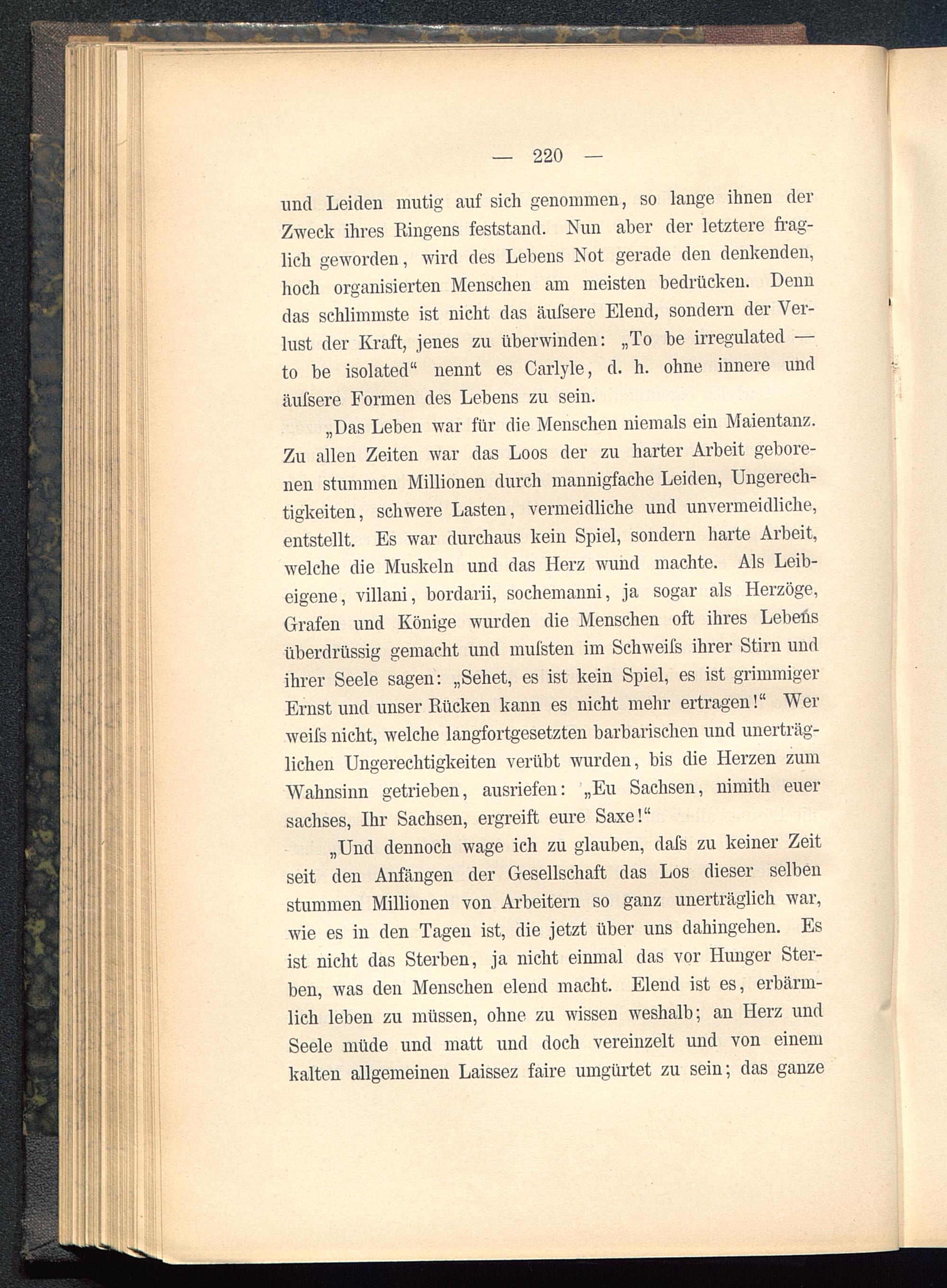„Und dennoch wage ich zu glauben, dafs zu keiner Zeitseit den Anfängen der Gesellschaft das Los dieser selbenstummen Millionen von Arbeitern so ganz unerträglich war,wie es in den Tagen ist, die jetzt über uns dahingehen. Esist nicht das Sterben, ja nicht einmal das vor Hunger Ster-ben, was den Menschen elend macht. Elend ist es, erbärm-lich leben zu müssen, ohne zu wissen weshalb; an Herz undSeele müde und matt und doch vereinzelt und von einemkalten allgemeinen Laissez faire umgürtet zu sein; das ganze