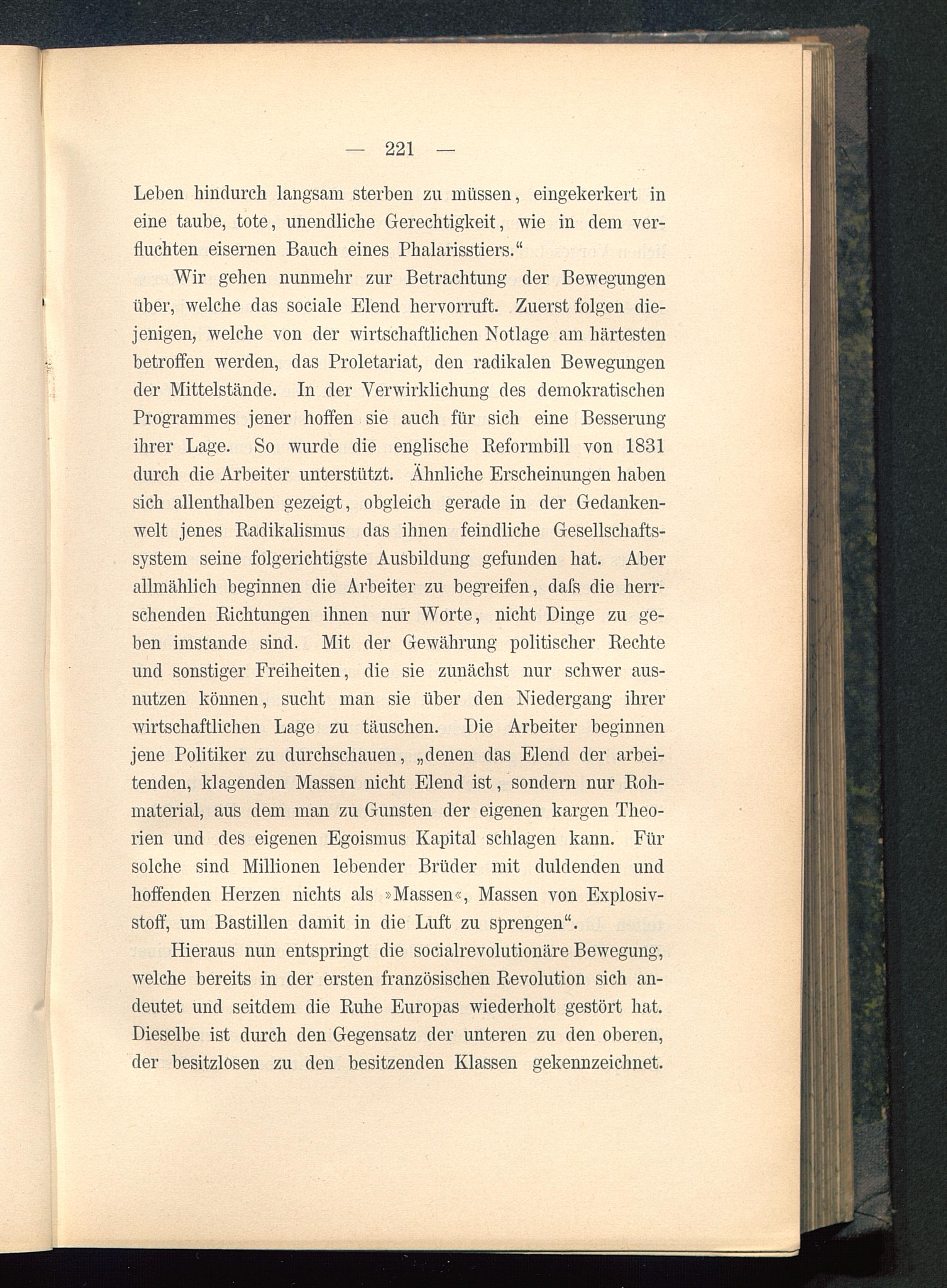 Hieraus nun entspringt die socialrevolutionäre Bewegung,welche bereits in der ersten französischen Revolution sich an-deutet und seitdem die Ruhe Europas wiederholt gestört hat.Dieselbe ist durch den Gegensatz der unteren zu den oberen,der besitzlosen zu den besitzenden Klassen gekennzeichnet.