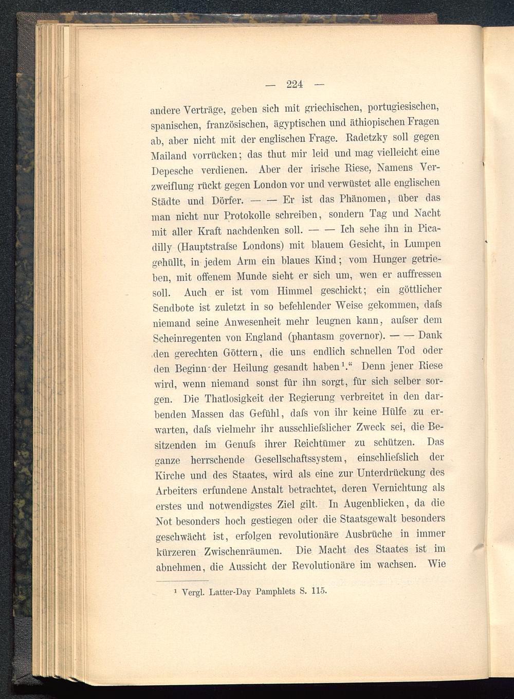 den gerechten Göttern, die uns endlich schnellen Tod oderden Beginn der Heilung gesandt haben 1 ." Denn jener Riesewird, wenn niemand sonst für ihn sorgt, für sich selber sor-gen. Die Thatlosigkeit der Regierung verbreitet in den dar-benden Massen das Gefühl, dafs von ihr keine Hülfe zu er-warten, dafs vielmehr ihr ausschliefslicher Zweck sei, die Be-sitzenden im Genufs ihrer Reichtümer zu schützen. Dasganze herrschende Gesellschaftssystem, einschliefslich derKirche und des Staates, wird als eine zur Unterdrückung desArbeiters erfundene Anstalt betrachtet, deren Vernichtung alserstes und notwendigstes Ziel gilt. In Augenblicken, da dieNot besonders hoch gestiegen oder die Staatsgewalt besondersgeschwächt ist, erfolgen revolutionäre Ausbrüche in immerkürzeren Zwischenräumen. Die Macht des Staates ist imabnehmen, die Aussicht der Revolutionäre im wachsen. Wie