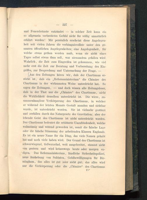 j^Aus den Zeitungen hören wir, dafs der Chartismus er-stickt ist, dafs ein „Reformministerium" die Chimäre desChartismus in der wirksamsten Weise unterdrückt hat. Sosagen die Zeitungen, — und doch wissen alle Zeitungsleser,dafs in der That nur die „Chimäre" des Chartismus, nichtdie Wirklichkeit desselben unterdrückt ist. Die wirre, zu-sammenhanglose Verkörperung des Chartismus, in welcherer während der letzten Monate Gestalt annahm und sichtbarwurde, ist unterdrückt worden. Sie ist vielmehr gestürztund zerfallen durch das Naturgesetz der Gravitation; aber derlebende Geist des Chartismus ist nicht unterdrückt worden.Der Chartismus bedeutet die erbitterte Unzufriedenheit, welchewahnsinnig und wütend geworden ist, somit die falsche Lageoder die falsche Stimmung der arbeitenden Klassen Englands .Es ist ein neuer Name für ein Ding, das viele Namen gehabthat und noch viele haben wird. Der Grund des Chartismus istschwerwiegend, tiefwurzelnd, weit ausgebreitet, stammt nichtvon gestern und wird keineswegs heute oder morgen en-digen. Das Reformministerium, ländliche Sicherheitspolizei,neue Aushebung von Soldaten, Geldbewilligungen für Bir-mingham , das alles ist gut oder nicht gut; das alles wird