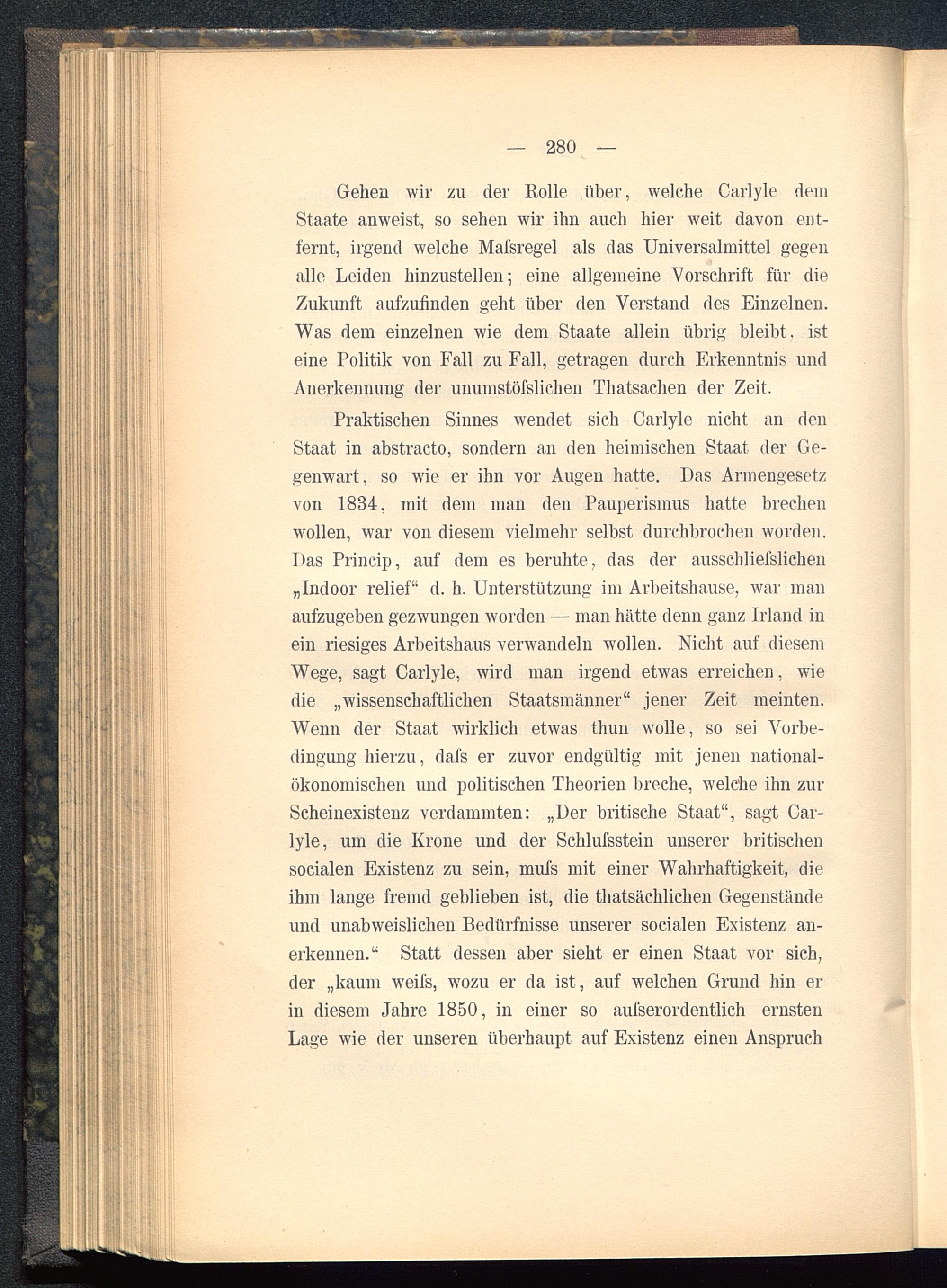 Praktischen Sinnes wendet sich Carlyle nicht an denStaat in abstracto, sondern an den heimischen Staat der Ge-genwart, so wie er ihn vor Augen hatte. Das Armengesetzvon 1834, mit dem man den Pauperismus hatte brechenwollen, war von diesem vielmehr selbst durchbrochen worden.Das Princip, auf dem es beruhte , das der ausschliefslichen„Indoor relief" d. h. Unterstützung im Arbeitshause, war manaufzugeben gezwungen worden — man hätte denn ganz Irland inein riesiges Arbeitshaus verwandeln wollen. Nicht auf diesemWege, sagt Carlyle, wird man irgend etwas erreichen, wiedie „wissenschaftlichen Staatsmänner" jener Zeit meinten.Wenn der Staat wirklich etwas thun wolle, so sei Vorbe-dingung hierzu, dafs er zuvor endgültig mit jenen national-ökonomischen und politischen Theorien breche, welche ihn zurScheinexistenz verdammten: „Der britische Staat", sagt Car-lyle, um die Krone und der Schlufsstein unserer britischensocialen Existenz zu sein, mufs mit einer Wahrhaftigkeit, dieihm lange fremd geblieben ist, die thatsächlichen Gegenständeund unabweislichen Bedürfnisse unserer socialen Existenz an-erkennen." Statt dessen aber sieht er einen Staat vor sich,der „kaum weifs, wozu er da ist, auf welchen Grund hin erin diesem Jahre 1850, in einer so aufserordentlich ernstenLage wie der unseren überhaupt auf Existenz einen Anspruch