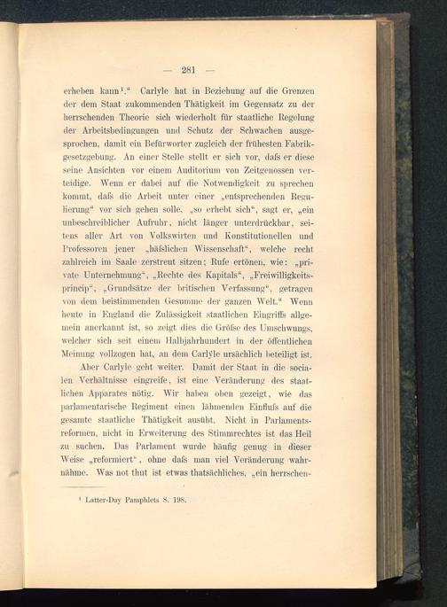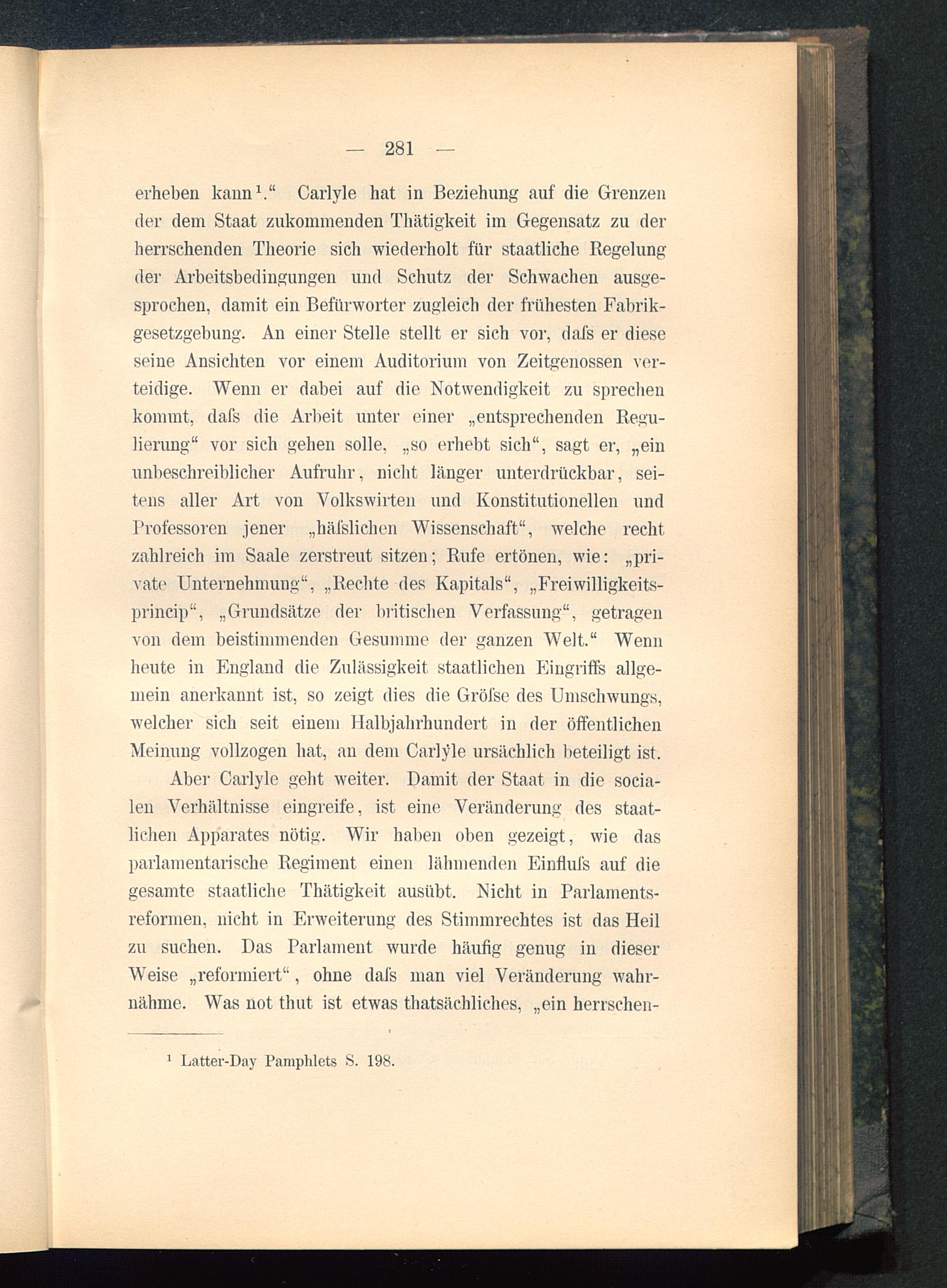 erheben kann 1 ." Carlyle hat in Beziehung auf die Grenzender dem Staat zukommenden Thätigkeit im Gegensatz zu derherrschenden Theorie sich wiederholt für staatliche Regelungder Arbeitsbedingungen und Schutz der Schwachen ausge-sprochen, damit ein Befürworter zugleich der frühesten Fabrik-gesetzgebung. An einer Stelle stellt er sich vor, dafs er dieseseine Ansichten vor einem Auditorium von Zeitgenossen ver-teidige. Wenn er dabei auf die Notwendigkeit zu sprechenkommt, dafs die Arbeit unter einer „entsprechenden Regu-lierung" vor sich gehen solle, „so erhebt sich", sagt er, „einunbeschreiblicher Aufruhr, nicht länger unterdrückbar, sei-tens aller Art von Volkswirten und Konstitutionellen undProfessoren jener „häfslichen Wissenschaft", welche rechtzahlreich im Saale zerstreut sitzen; Rufe ertönen, wie: „pri-vate Unternehmung", „Rechte des Kapitals", „Freiwilligkeits-princip", „Grundsätze der britischen Verfassung", getragenvon dem beistimmenden Gesumme der ganzen Welt." Wennheute in England die Zulässigkeit staatlichen Eingriffs allge-mein anerkannt ist, so zeigt dies die Gröfse des Umschwungs,welcher sich seit einem Halbjahrhundert in der öffentlichenMeinung vollzogen hat, an dem Carlyle ursächlich beteiligt ist.