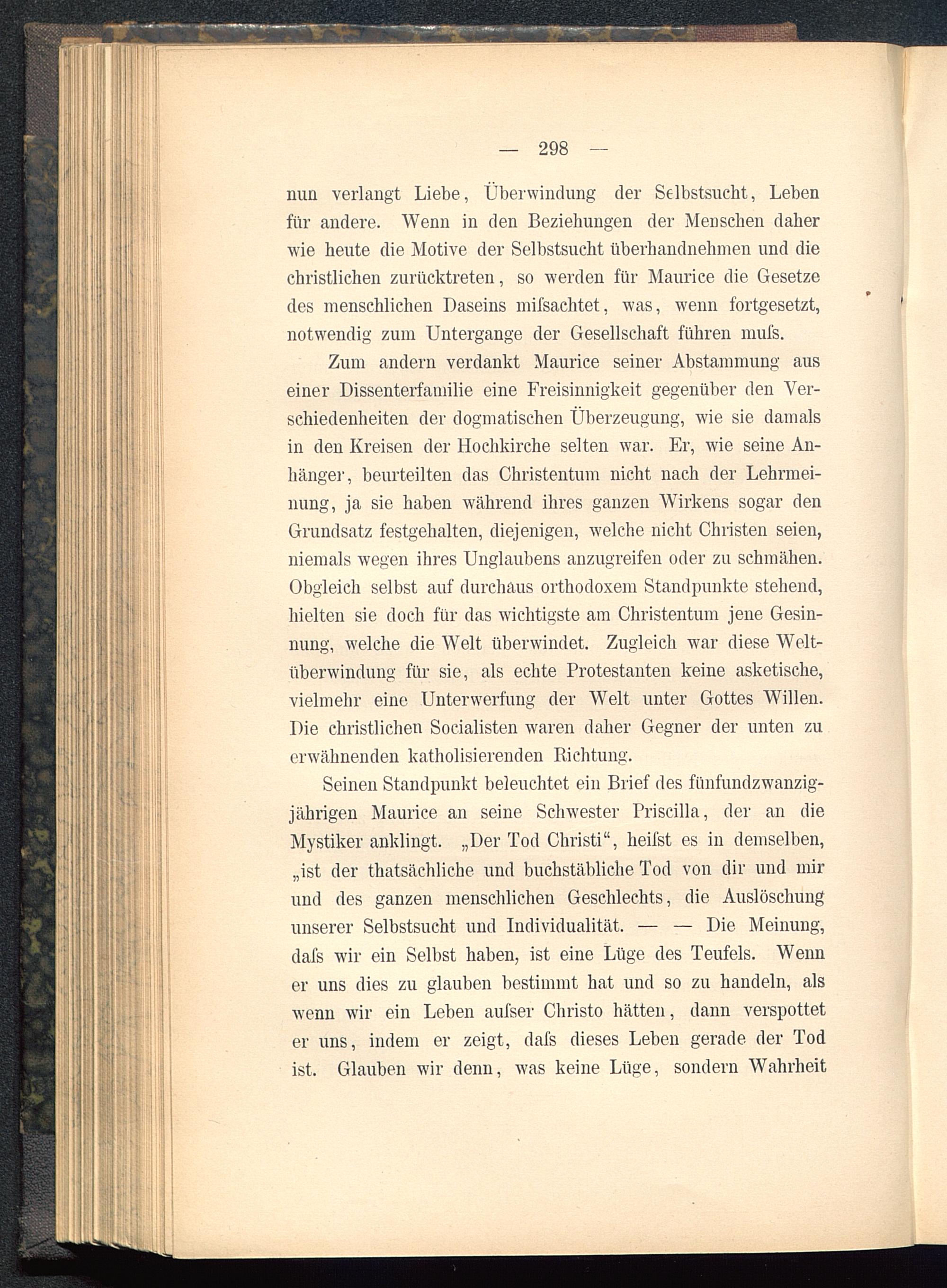 Seinen Standpunkt beleuchtet ein Brief des fünfundzwanzig-jährigen Maurice an seine Schwester Priscilla, der an dieMystiker anklingt. „Der Tod Christi", heilst es in demselben,„ist der thatsächliche und buchstäbliche Tod von dir und mirund des ganzen menschlichen Geschlechts, die Auslöschungunserer Selbstsucht und Individualität. — — Die Meinung,dafs wir ein Selbst haben, ist eine Lüge des Teufels. Wenner uns dies zu glauben bestimmt hat und so zu handeln, alswenn wir ein Leben aufser Christo hätten, dann verspotteter uns, indem er zeigt, dafs dieses Leben gerade der Todist. Glauben wir denn, was keine Lüge, sondern Wahrheit