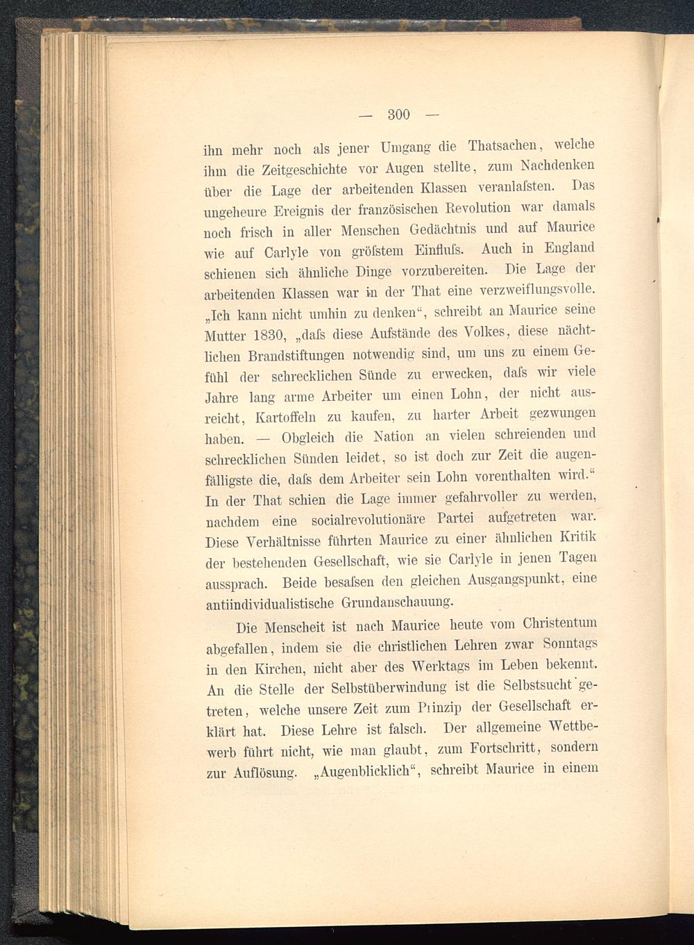 ihn mehr noch als jener Umgang die Thatsachen , welcheihm die Zeitgeschichte vor Augen stellte, zum Nachdenkenüber die Lage der arbeitenden Klassen veranlafsten. Dasungeheure Ereignis der französischen Revolution war damalsnoch frisch in aller Menschen Gedächtnis und auf Mauricewie auf Carlyle von gröfstem Einflufs. Auch in England schienen sich ähnliche Dinge vorzubereiten. Die Lage derarbeitenden Klassen war in der That eine verzweiflungsvolle.„Ich kann nicht umhin zu denken", schreibt an Maurice seineMutter 1830, „dafs diese Aufstände des Volkes, diese nächt-lichen Brandstiftungen notwendig sind, um uns zu einem Ge-fühl der schrecklichen Sünde zu erwecken, dafs wir vieleJahre lang arme Arbeiter um einen Lohn, der nicht aus-reicht, Kartoffeln zu kaufen, zu harter Arbeit gezwungenhaben. — Obgleich die Kation an vielen schreienden undschrecklichen Sünden leidet, so ist doch zur Zeit die augen-fälligste die, dafs dem Arbeiter sein Lohn vorenthalten wird."In der That schien die Lage immer gefahrvoller zu werden,nachdem eine socialrevolutionäre Partei aufgetreten war.Diese Verhältnisse führten Maurice zu einer ähnlichen Kritikder bestehenden Gesellschaft, wie sie Carlyle in jenen Tagenaussprach. Beide besafsen den gleichen Ausgangspunkt, eineantiindividualistische Grundanschauung.