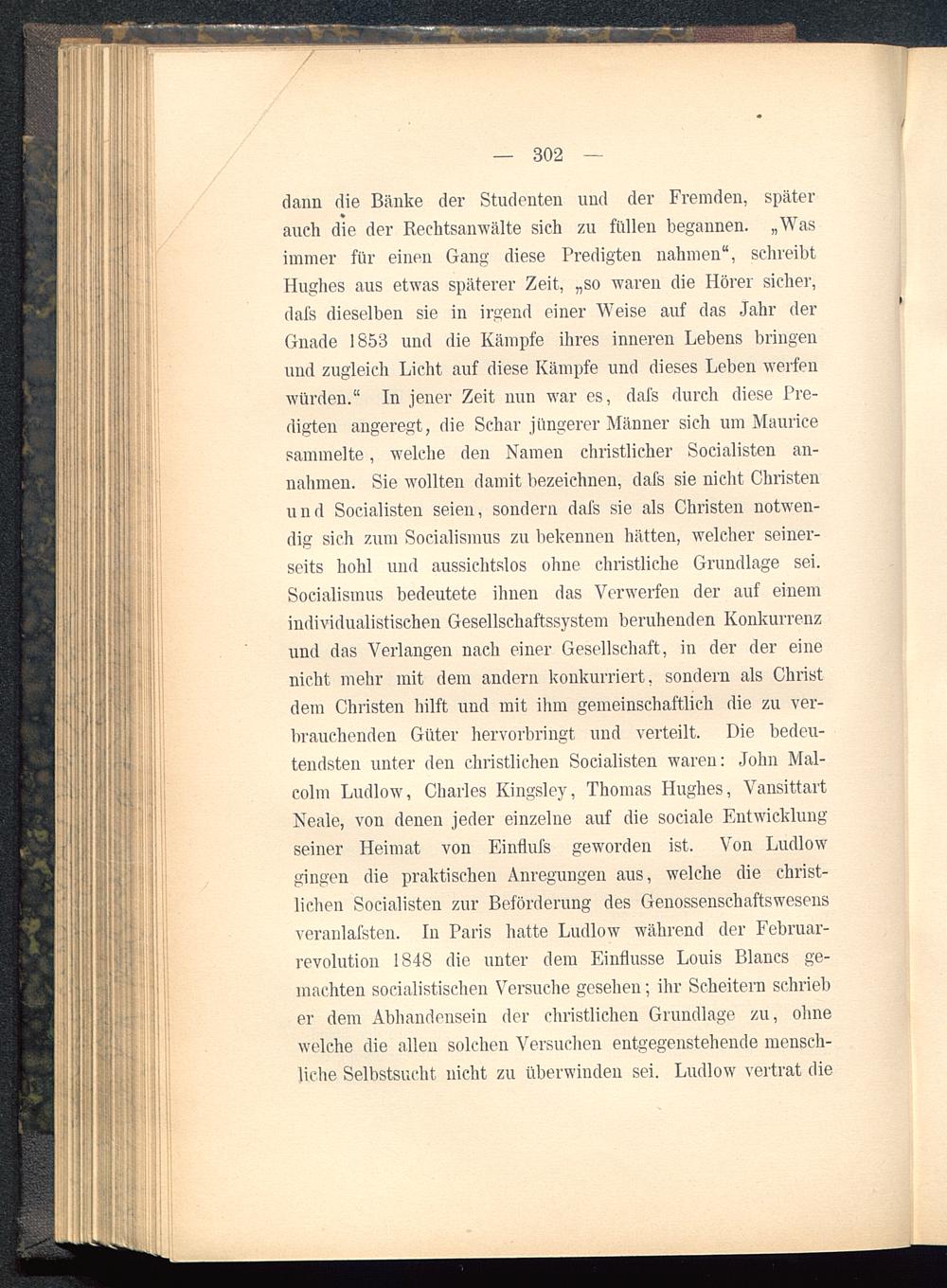 auch die der Rechtsanwälte sich zu füllen begannen. „Wasimmer für einen Gang diese Predigten nahmen", schreibtHughes aus etwas späterer Zeit, „so waren die Hörer sicher,dafs dieselben sie in irgend einer Weise auf das Jahr derGnade 1853 und die Kämpfe ihres inneren Lebens bringenund zugleich Licht auf diese Kämpfe und dieses Leben werfenwürden." In jener Zeit nun war es, dafs durch diese Pre-digten angeregt, die Schar jüngerer Männer sich um Mauricesammelte, welche den Namen christlicher Socialisten an-nahmen. Sie wollten damit bezeichnen, dafs sie nicht Christenund Socialisten seien, sondern dafs sie als Christen notwen-dig sich zum Socialismus zu bekennen hätten, welcher seiner-seits hohl und aussichtslos ohne christliche Grundlage sei.Socialismus bedeutete ihnen das Verwerfen der auf einemindividualistischen Gesellschaftssystem beruhenden Konkurrenzund das Verlangen nach einer Gesellschaft, in der der einenicht mehr mit dem andern konkurriert, sondern als Christdem Christen hilft und mit ihm gemeinschaftlich die zu ver-brauchenden Güter hervorbringt und verteilt. Die bedeu-tendsten unter den christlichen Socialisten waren: John Mal-colm Ludlow, Charles Kingsley, Thomas Hughes , VansittartNeale, von denen jeder einzelne auf die sociale Entwicklungseiner Heimat von Einflufs geworden ist. Von Ludlowgingen die praktischen Anregungen aus, welche die christ-lichen Socialisten zur Beförderung des Genossenschaftswesensveranlafsten. In Paris hatte Ludlow während der Februar-revolution 1848 die unter dem Einflüsse Louis Blancs ge-machten socialistischen Versuche gesehen; ihr Scheitern schrieber dem Abhandensein der christlichen Grundlage zu, ohnewelche die allen solchen Versuchen entgegenstehende mensch-liche Selbstsucht nicht zu überwinden sei. Ludlow vertrat die
