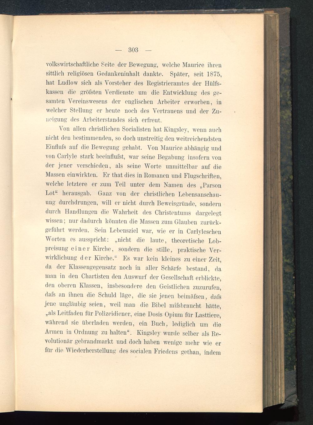 Von allen christlichen Socialisten hat Kingsley, wenn auchnicht den bestimmenden, so doch unstreitig den weitreichendstenEinflufs auf die Bewegung gehabt. Von Maurice abhängig undvon Carlyle stark beeinflufst, war seine Begabung insofern vonder jener verschieden, als seine Worte unmittelbar auf dieMassen einwirkten. Er that dies in Romanen und Flugschriften,welche letztere er zum Teil unter dem Namen des „ParsonLot" herausgab. Ganz von der christlichen Lebensanschau-ung durchdrungen, will er nicht durch Beweisgründe, sonderndurch Handlungen die Wahrheit des Christentums dargelegtwissen; nur dadurch könnten die Massen zum Glauben zurück-geführt werden. Sein Lebensziel war, wie er in CarlyleschenWorten es ausspricht: „nicht die laute, theoretische Lob-preisung einer Kirche, sondern die stille, praktische Ver-wirklichung der Kirche." Es war kein kleines zu einer Zeit,da der Klassengegensatz noch in aller Schärfe bestand, daman in den Chartisten den Auswurf der Gesellschaft erblickte,den oberen Klassen, insbesondere den Geistlichen zuzurufen,dafs an ihnen die Schuld läge, die sie jenen beimäfsen, dafsjene ungläubig seien, weil man die Bibel mifsbraucht hätte,„als Leitfaden für Polizeidiener, eine Dosis Opium für Lasttiere,während sie überladen werden, ein Buch, lediglich um dieArmen in Ordnung zu halten". Kingsley wurde selber als Re-volutionär gebrandmarkt und doch haben wenige mehr wie erfür die Wiederherstellung des socialen Friedens gethan, indem
