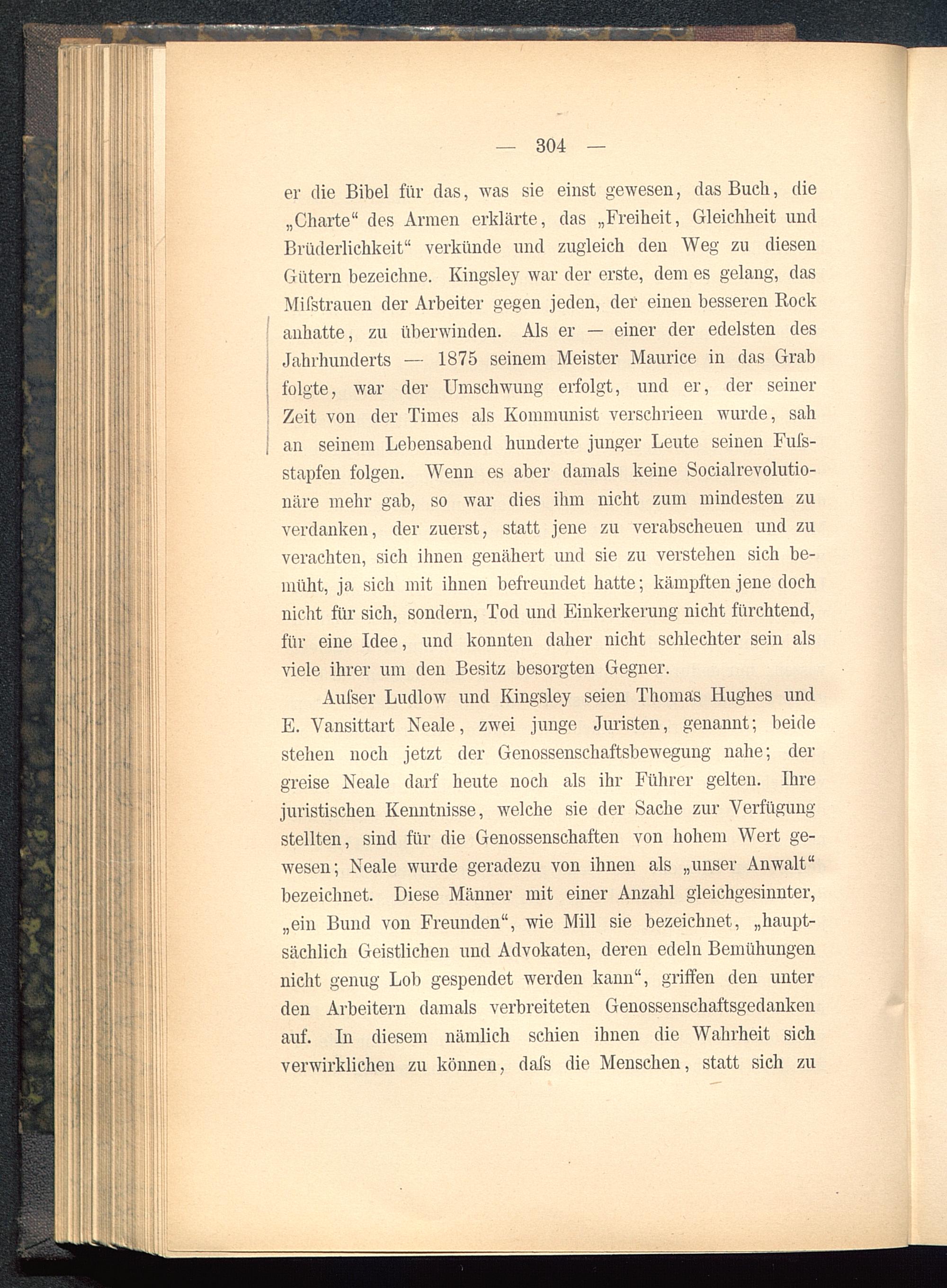 Aufser Ludlow und Kingsley seien Thomas Hughes undE. Vansittart Neale, zwei junge Juristen, genannt; beidestehen noch jetzt der Genossenschaftsbewegung nahe; dergreise Neale darf heute noch als ihr Führer gelten. Ihrejuristischen Kenntnisse, welche sie der Sache zur Verfügungstellten, sind für die Genossenschaften von hohem Wert ge-wesen; Neale wurde geradezu von ihnen als „unser Anwalt"bezeichnet. Diese Männer mit einer Anzahl gleichgesinnter,„ein Bund von Freunden", wie Mill sie bezeichnet, „haupt-sächlich Geistlichen und Advokaten, deren edeln Bemühungennicht genug Lob gespendet werden kann", griffen den unterden Arbeitern damals verbreiteten Genossenschaftsgedankenauf. In diesem nämlich schien ihnen die Wahrheit sichverwirklichen zu können, dafs die Menschen, statt sich zu