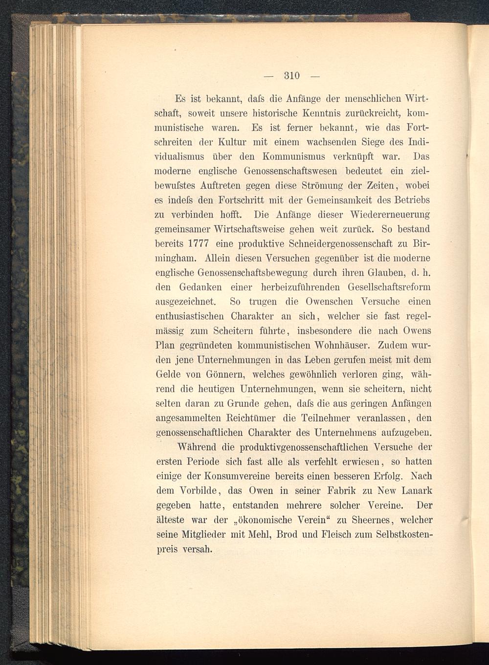 Während die produktivgenossenschaftlichen Versuche derersten Periode sich fast alle als verfehlt erwiesen, so hatteneinige der Konsumvereine bereits einen besseren Erfolg. Nachdem Vorbilde, das Owen in seiner Fabrik zu New Lanarkgegeben hatte, entstanden mehrere solcher Vereine. Derälteste war der „ökonomische Verein" zu Sheernes, welcherseine Mitglieder mit Mehl, Brod und Fleisch zum Selbstkosten-preis versah.