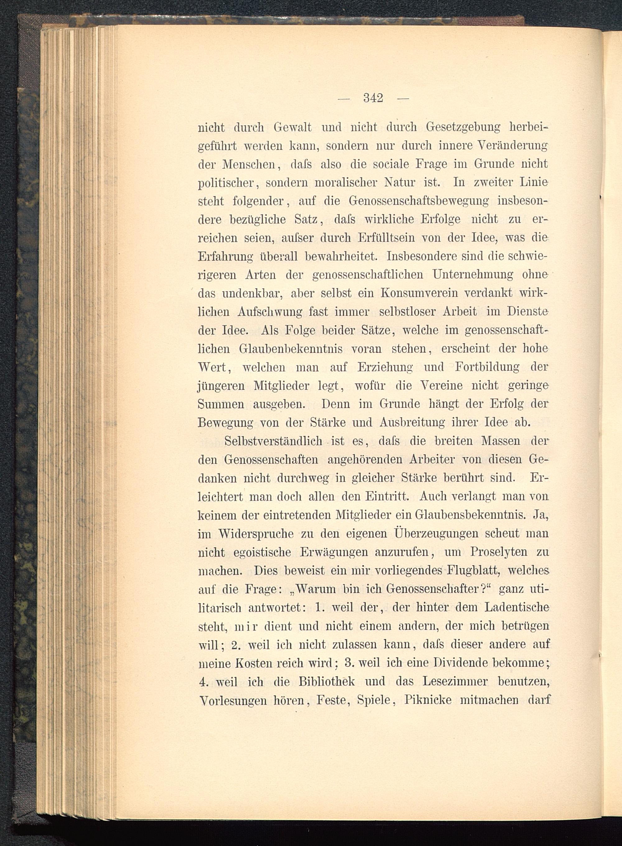 Selbstverständlich ist es, dafs die breiten Massen derden Genossenschaften angehörenden Arbeiter von diesen Ge-danken nicht durchweg in gleicher Stärke berührt sind. Er-leichtert man doch allen den Eintritt. Auch verlangt man vonkeinem der eintretenden Mitglieder ein Glaubensbekenntnis. Ja,im Widerspruche zu den eigenen Überzeugungen scheut mannicht egoistische Erwägungen anzurufen, um Proselyten zumachen. Dies beweist ein mir vorliegendes Flugblatt, welchesauf die Frage: „Warum bin ich Genossenschafter?" ganz uti-litarisch antwortet: 1. weil der, der hinter dem Ladentischesteht, mir dient und nicht einem andern, der mich betrügenwill; 2. weil ich nicht zulassen kann, dafs dieser andere aufmeine Kosten reich wird: 3. weil ich eine Dividende bekomme;4. weil ich die Bibliothek und das Lesezimmer benutzen,Vorlesungen hören, Feste, Spiele, Piknicke mitmachen darf