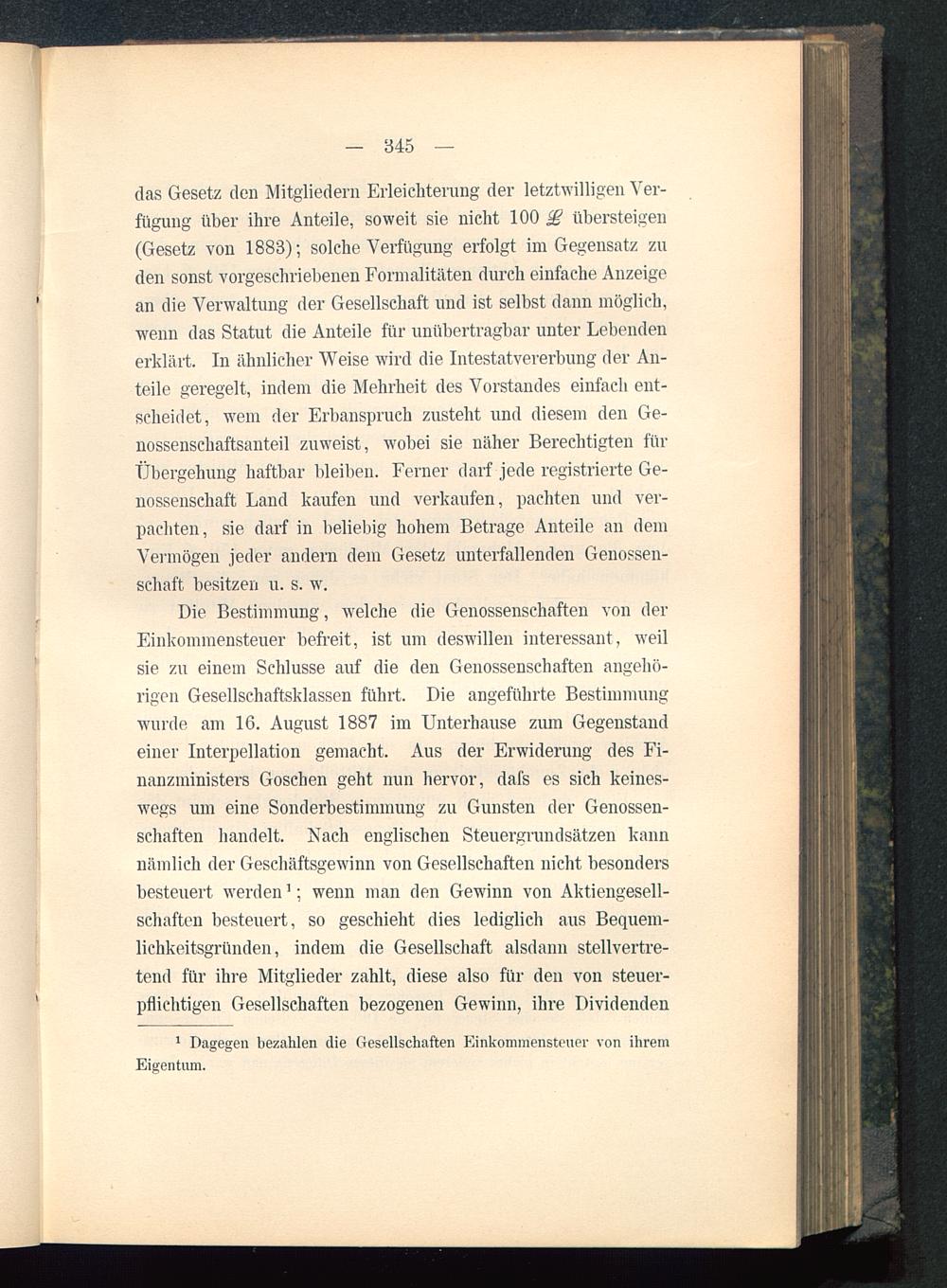 Die Bestimmung, welche die Genossenschaften von derEinkommensteuer befreit, ist um deswillen interessant, weilsie zu einem Schlüsse auf die den Genossenschaften ungehö-rigen Gesellschaftsklassen führt. Die angeführte Bestimmungwurde am 16. August 1887 im Unterhause zum Gegenstandeiner Interpellation gemacht. Aus der Erwiderung des Fi-nanzministers Goschen geht nun hervor, dafs es sich keines-wegs um eine Sonderbestimmung zu Gunsten der Genossen-schaften handelt. Nach englischen Steuergrundsätzen kannnämlich der Geschäftsgewinn von Gesellschaften nicht besondersbesteuert werden 1 ; wenn man den Gewinn von Aktiengesell-schaften besteuert, so geschieht dies lediglich aus Bequem-lichkeitsgründen, indem die Gesellschaft alsdann stellvertre-tend für ihre Mitglieder zahlt, diese also für den von steuer-pflichtigen Gesellschaften bezogenen Gewinn, ihre Dividenden