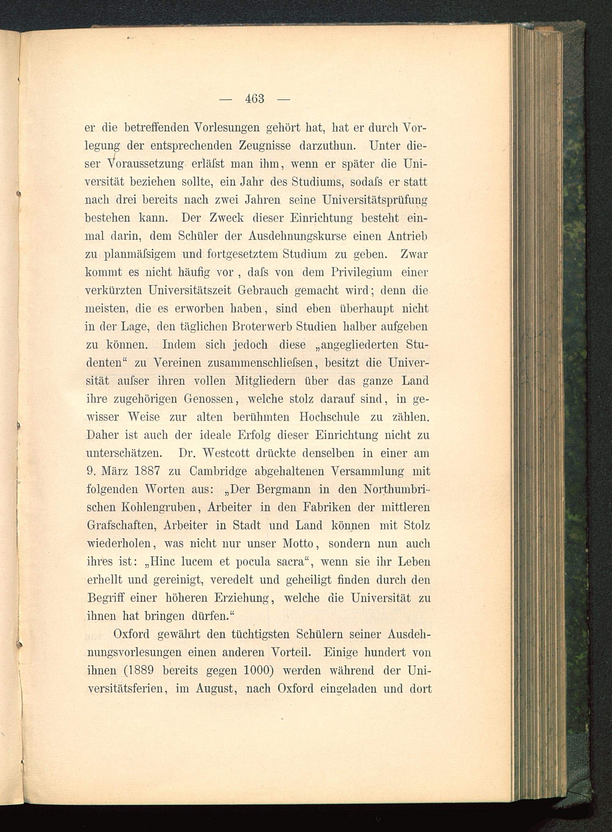 Oxford gewährt den tüchtigsten Schülern seiner Ausdeh-nungsvorlesungen einen anderen Vorteil. Einige hundert vonihnen (1889 bereits gegen 1000) werden während der Uni-versitätsferien, im August, nach Oxford eingeladen und dort