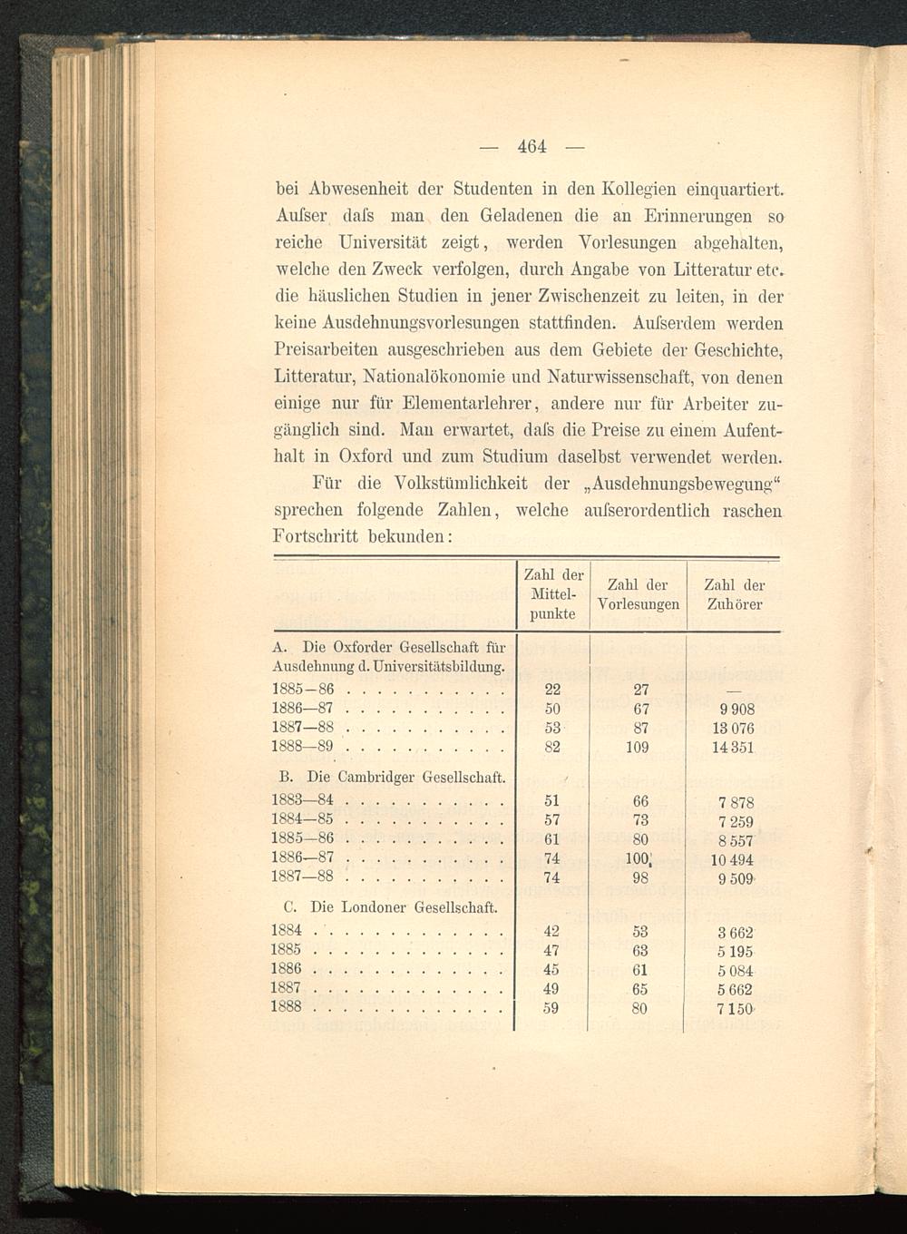 bei Abwesenheit der Studenten in den Kollegien einquartiert.Aufser dafs man den Geladenen die an Erinnerungen soreiche Universität zeigt, werden Vorlesungen abgehalten,welche den Zweck verfolgen, durch Angabe von Litteratur etc.die häuslichen Studien in jener Zwischenzeit zu leiten, in derkeine Ausdehnungsvorlesungen stattfinden. Aufserdem werdenPreisarbeiten ausgeschrieben aus dem Gebiete der Geschichte,Litteratur, Nationalökonomie und Naturwissenschaft, von deneneinige nur für Elementarlehrer, andere nur für Arbeiter zu-gänglich sind. Man erwartet, dafs die Preise zu einem Aufent-halt in Oxford und zum Studium daselbst verwendet werden.