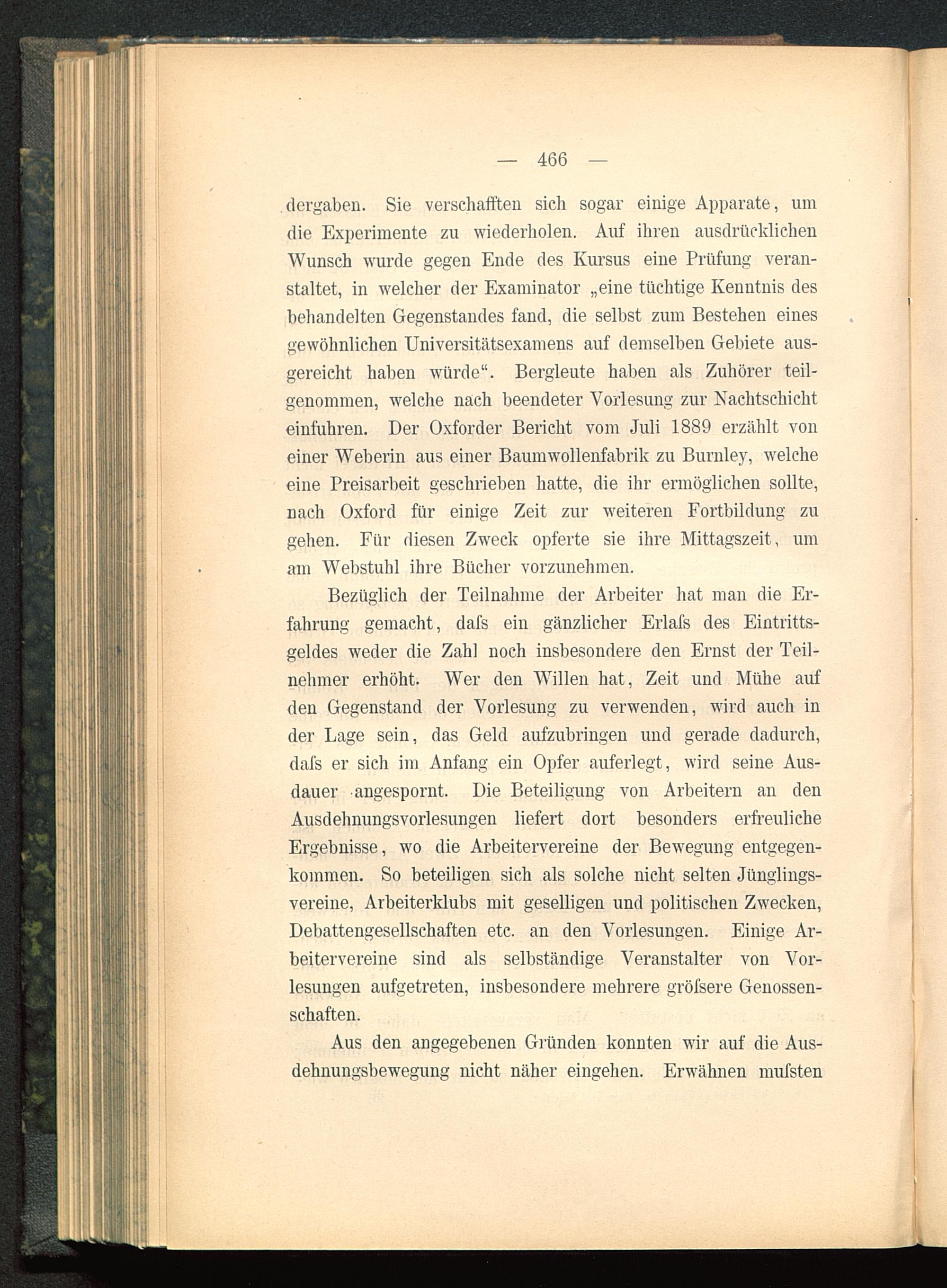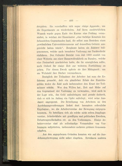 hergaben. Sie verschafften sich sogar einige Apparate, umdie Experimente zu wiederholen. Auf ihren ausdrücklichenWunsch wurde gegen Ende des Kursus eine Prüfung veran-staltet, in welcher der Examinator „eine tüchtige Kenntnis desbehandelten Gegenstandes fand, die selbst zum Bestehen einesgewöhnlichen Universitätsexamens auf demselben Gebiete aus-gereicht haben würde". Bergleute haben als Zuhörer teil-genommen, welche nach beendeter Vorlesung zur Nachtschichteinfuhren. Der Oxforder Bericht vom Juli 1889 erzählt voneiner Weberin aus einer Baumwollenfabrik zu Burnley, welcheeine Preisarbeit geschrieben hatte, die ihr ermöglichen sollte,nach Oxford für einige Zeit zur weiteren Fortbildung zugehen. Für diesen Zweck opferte sie ihre Mittagszeit, umam Webstuhl ihre Bücher vorzunehmen.