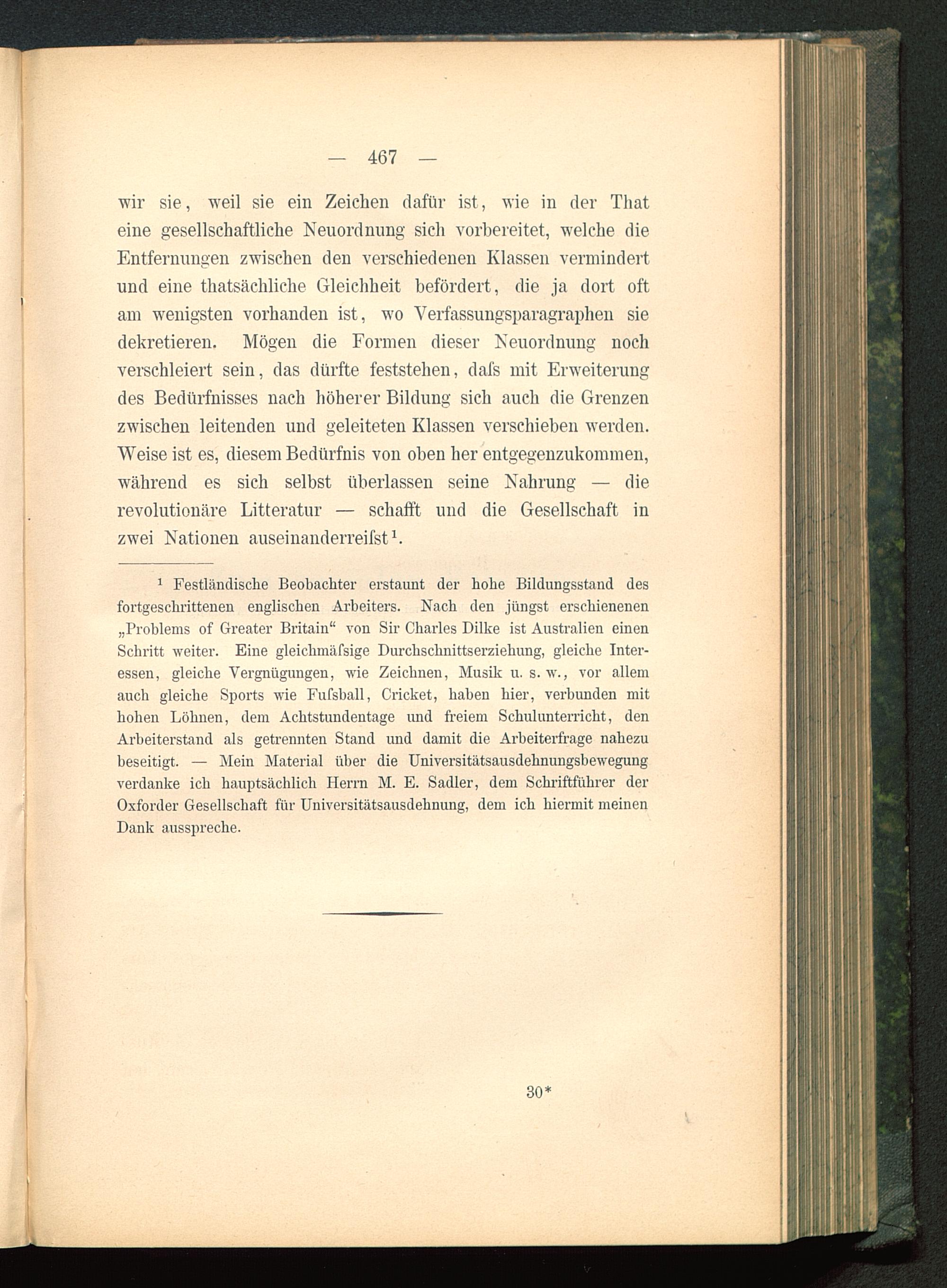 1 Festländische Beobachter erstaunt der hohe Bildungsstand desfortgeschrittenen englischen Arbeiters. Nach den jüngst erschienenen„Problems of Greater Britain" von Sir Charles Dilke ist Australien einenSchritt weiter. Eine gleichmäfsige Durchschnittserziehung, gleiche Inter-essen, gleiche Vergnügungen, wie Zeichnen, Musik u.s.w., vor allemauch gleiche Sports wie Fufsball, Cricket, haben hier, verbunden mithohen Löhnen, dem Achtstundentage und freiem Schulunterricht, denArbeiterstand als getrennten Stand und damit die Arbeiterfrage nahezubeseitigt. — Mein Material über die Universitätsausdehnungsbewegungverdanke ich hauptsächlich Herrn M. E. Sadler, dem Schriftführer derOxforder Gesellschaft für Universitätsausdehnung, dem ich hiermit meinenDank ausspreche.
