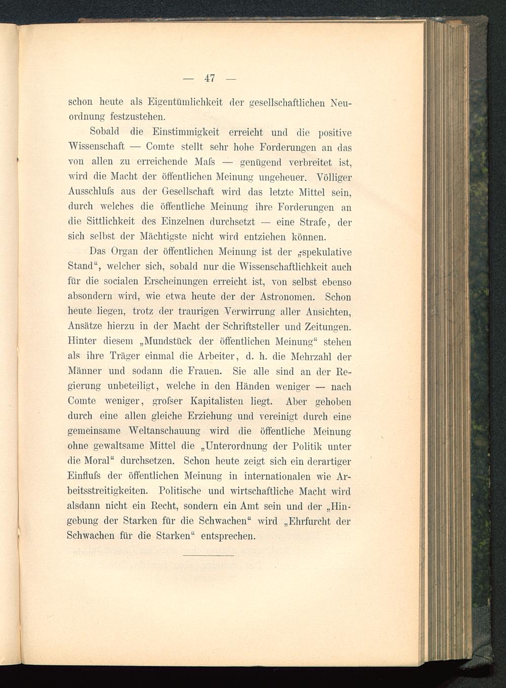 Sobald die Einstimmigkeit erreicht und die positiveWissenschaft — Comte stellt sehr hohe Forderungen an dasvon allen zu erreichende Mafs — genügend verbreitet ist,wird die Macht der öffentlichen Meinung ungeheuer. VölligerAusschlufs aus der Gesellschaft wird das letzte Mittel sein,durch welches die öffentliche Meinung ihre Forderungen andie Sittlichkeit des Einzelnen durchsetzt — eine Strafe, dersich selbst der Mächtigste nicht wird entziehen können.