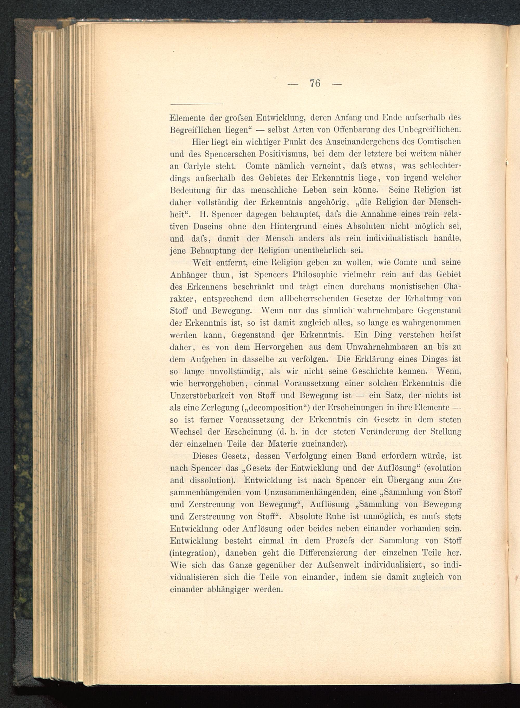 Weit entfernt, eine Religion geben zu wollen, wie Comte und seineAnhänger thun, ist Spencers Philosophie vielmehr rein auf das Gebietdes Erkennens beschränkt und trägt einen durchaus monistischen Cha-rakter, entsprechend dem allbeherrschenden Gesetze der Erhaltung vonStoff und Bewegung. Wenn nur das sinnlich" wahrnehmbare Gegenstandder Erkenntnis ist, so ist damit zugleich alles, so lange es wahrgenommenwerden kann, Gegenstand 4er Erkenntnis. Ein Ding verstehen heifstdaher, es von dem Hervorgehen aus dem Unwahrnehmharen an bis zudem Aufgehen in dasselbe zu verfolgen. Die Erklärung eines Dinges istso lange unvollständig, als wir nicht seine Geschichte kennen. Wenn,wie hervorgehoben, einmal Voraussetzung einer solchen Erkenntnis dieUnzerstörbarkeit von Stoff und Bewegung ist — ein Satz, der nichts istals eine Zerlegung („decomposition") der Erscheinungen in ihre Elemente —so ist ferner Voraussetzung der Erkenntnis ein Gesetz in dem stetenWechsel der Erscheinung (d. h. in der steten Veränderung der Stellungder einzelnen Teile der Materie zueinander).