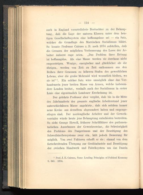 auch in England vorurteilsfreie Beobachter zu der Behaup-tung, dafs die Lage der unteren Klassen unter dem heu-tigen Gesellschaftssystem eine hoffnungslose sei — ein Satz,welcher die Grundlage des Marxischen Socialismus bildet.So konnte Professor Cairnes z. B. noch 1874 aufstellen, dafsdie Grenzen der möglichen Verbesserung des Loses' der Ar-beiter äufserst enge seien. „Das Problem ihrer Hebungist hoffnungslos. Als eine Masse werden sie durchaus nichtemporsteigen. Wenige, energischer und glücklicher als dieübrigen, werden von Zeit zu Zeit entkommen aus denReihen ihrer Genossen zu höheren Stufen des gewerblichenLebens, aber die grofse Mehrzahl wird wesentlich bleiben, wosie ist" x . Ein solcher Satz wäre unmöglich ohne das Vor-handensein jener breiten Masse von Armen, welche insbeson-dere London besitzt, weshalb.auch der Socialismus in ersterLinie eine eigentümlich Londoner Erscheinung ist.