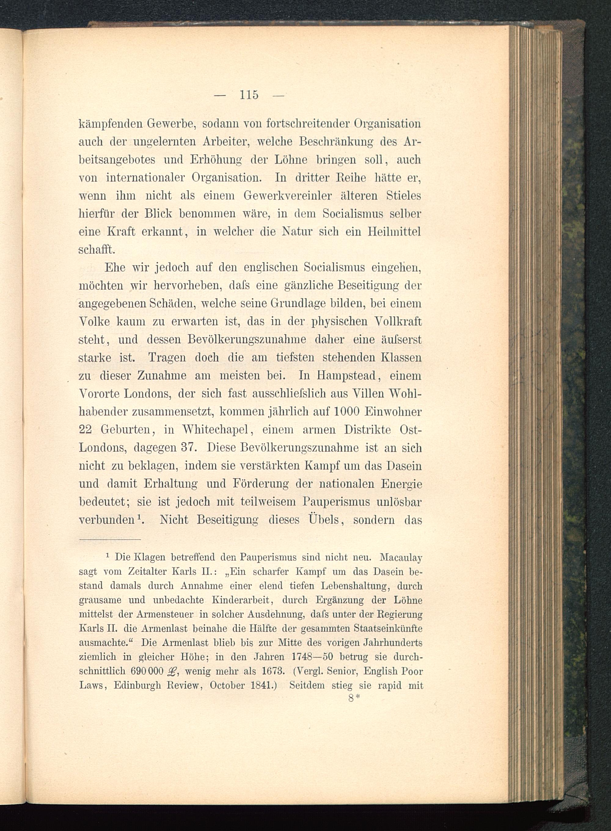 Ehe wir jedoch auf den englischen Socialismus eingehen,möchten wir hervorheben, dafs eine gänzliche Beseitigung derangegebenen Schäden, welche seine Grundlage bilden, bei einemVolke kaum zu erwarten ist, das in der physischen Vollkraftsteht, und dessen Bevölkerungszunahme daher eine äufserststarke ist. Tragen doch die am tiefsten stehenden Klassenzu dieser Zunahme am meisten bei. In Hampstead , einemVororte Londons , der sich fast ausschliefslich aus Villen Wohl-habender zusammensetzt, kommen jährlich auf 1000 Einwohner22 Geburten, in Whiteehapel, einem armen Distrikte Ost-Londons, dagegen 37. Diese Bevölkerungszunahme ist an sichnicht zu beklagen, indem sie verstärkten Kampf um das Daseinund damit Erhaltung und Förderung der nationalen Energiebedeutet; sie ist jedoch mit teilweisem Pauperismus unlösbarverbunden 1 . Nicht Beseitigung dieses Übels, sondern das