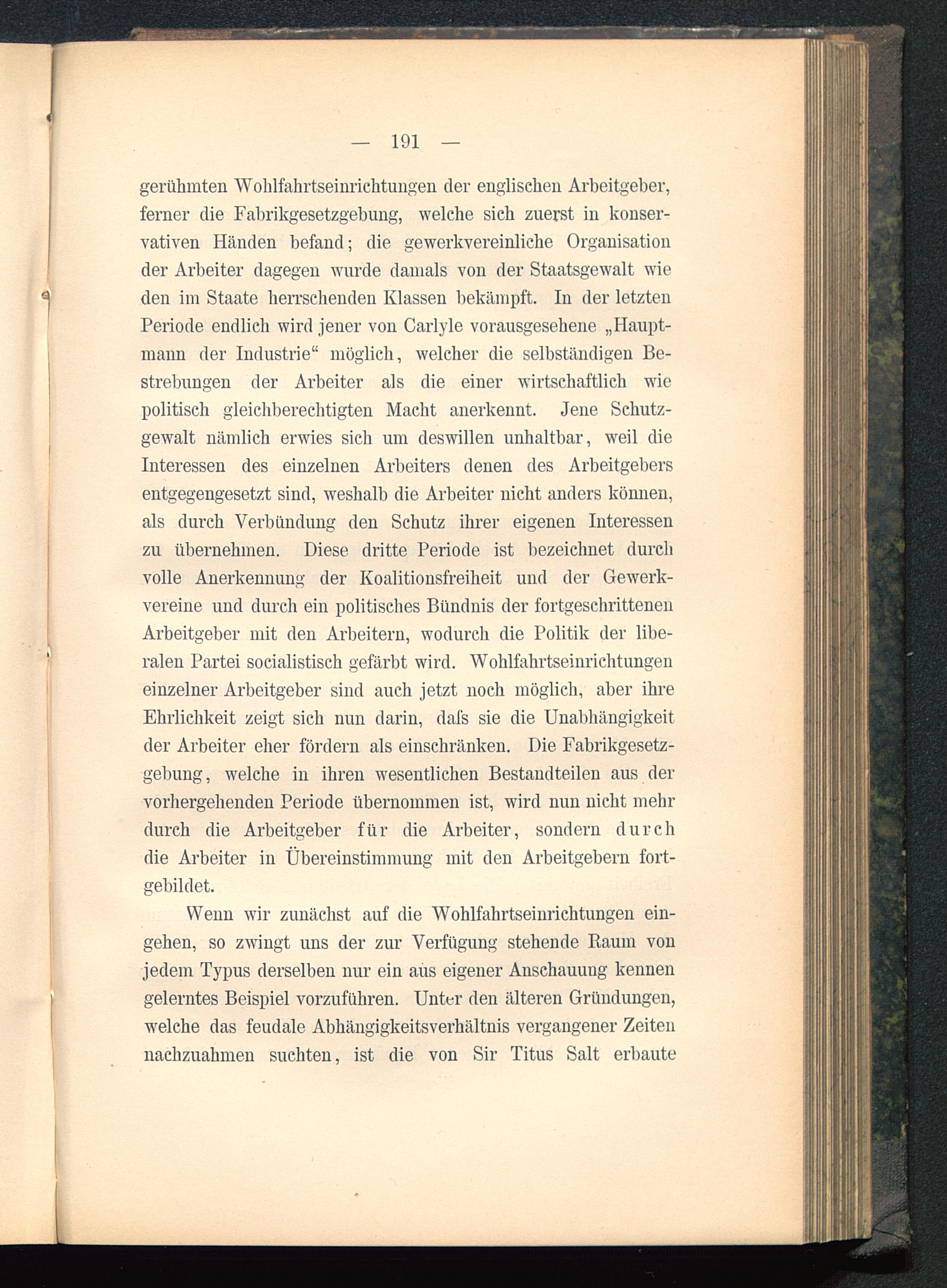 gerühmten Wohlfahrtseinrichtungen der englischen Arbeitgeber,ferner die Fabrikgesetzgebung, welche sich zuerst in konser-vativen Händen befand; die gewerkvereinliehe Organisationder Arbeiter dagegen wurde damals von der Staatsgewalt wieden im Staate herrschenden Klassen bekämpft. In der letztenPeriode endlich wird jener von Carlyle vorausgesehene „Haupt-mann der Industrie" möglich, welcher die selbständigen Be-strebungen der Arbeiter als die einer wirtschaftlich wiepolitisch gleichberechtigten Macht anerkennt. Jene Schutz-gewalt nämlich erwies sich um deswillen unhaltbar, weil dieInteressen des einzelnen Arbeiters denen des Arbeitgebersentgegengesetzt sind, weshalb die Arbeiter nicht anders können,als durch Verbündung den Schutz ihrer eigenen Interessenzu übernehmen. Diese dritte Periode ist bezeichnet durchvolle Anerkennung der Koalitionsfreiheit und der Gewerk-vereine und durch ein politisches Bündnis der fortgeschrittenenArbeitgeber mit den Arbeitern, wodurch die Politik der libe-ralen Partei socialistisch gefärbt wird. Wohlfahrtseinrichtungeneinzelner Arbeitgeber sind auch jetzt noch möglich, aber ihreEhrlichkeit zeigt sich nun darin, dafs sie die Unabhängigkeitder Arbeiter eher fördern als einschränken. Die Fabrikgesetz-gebung, welche in ihren wesentlichen Bestandteilen aus dervorhergehenden Periode übernommen ist, wird nun nicht mehrdurch die Arbeitgeher für die Arbeiter, sondern durchdie Arbeiter in Übereinstimmung mit den Arbeitgebern fort-gebildet.