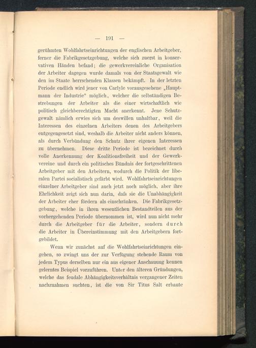 Wenn wir zunächst auf die Wohlfahrtseinrichtungen ein-gehen, so zwingt uns der zur Verfügung stehende Raum vonjedem Typus derselben nur ein aus eigener Anschauung kennengelerntes Beispiel vorzuführen. Unter den älteren Gründungen,welche das feudale Abhängigkeitsverhältnis vergangener Zeitennachzuahmen suchten, ist die von Sir Titus Salt erbaute